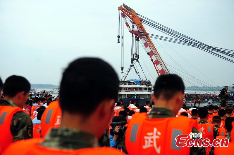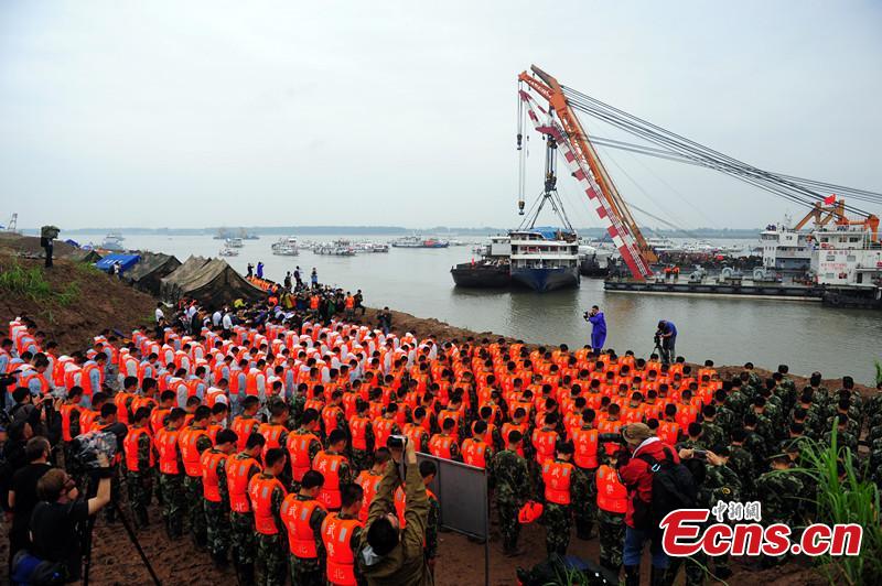 A mourning ceremony is held for victims on the capsized ship Eastern Star at the sinking site in the Jianli section of the Yangtze River, central China's Hubei Province, June 7, 2015. (CNS photo/Zhangchang)