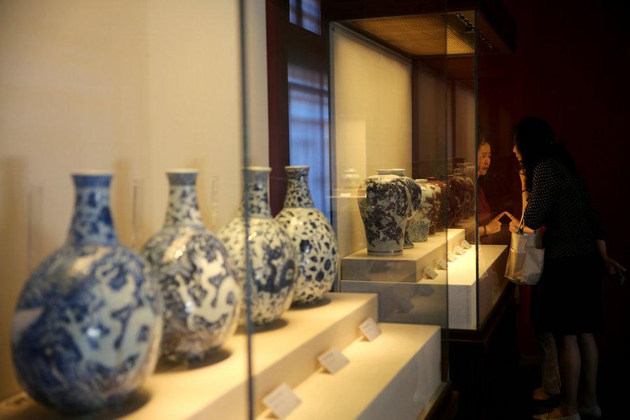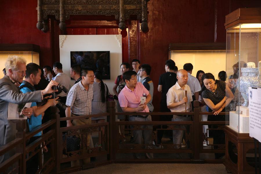 A new exhibition, "Imperial Ceramics and Porcelain of the Great Ming (1368-1644) : Comparisons of Excavated and Extant Ceramic Pieces from the Hongwu, Yongle, and Xuande Reigns (14th – 15th c.)," kicked off on Jun. 2, 2015 at the Palace Museum in Beijing. The show is one of the exhibitions to mark the 90th anniversary of the Palace Museum's establishment in the Forbidden City. It runs through Sept 2. (Photo/China.org.cn)