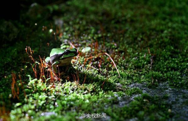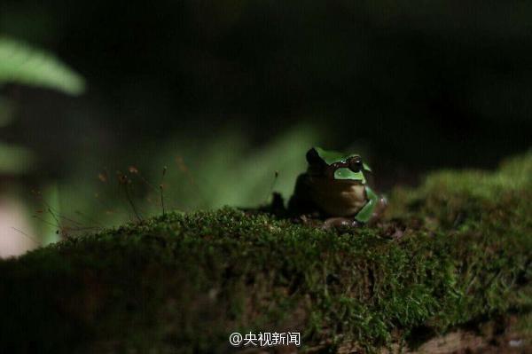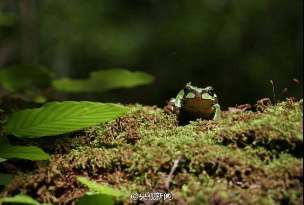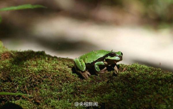 A tree frog is spotted at a scenic area in Foping county, North China’s Shaanxi province. The tree frog was rarely seen for a long time in Qinling Mountains due to the worsening environment of its habitat.(Photo/Weibo of CCTV)