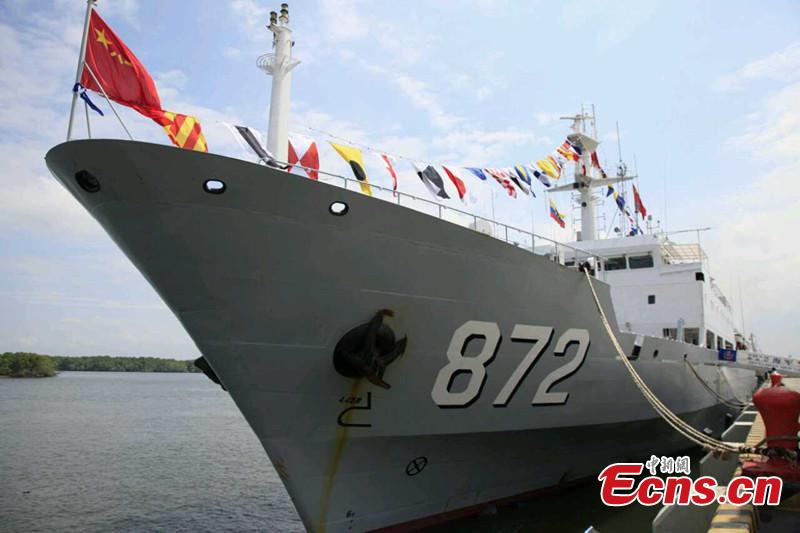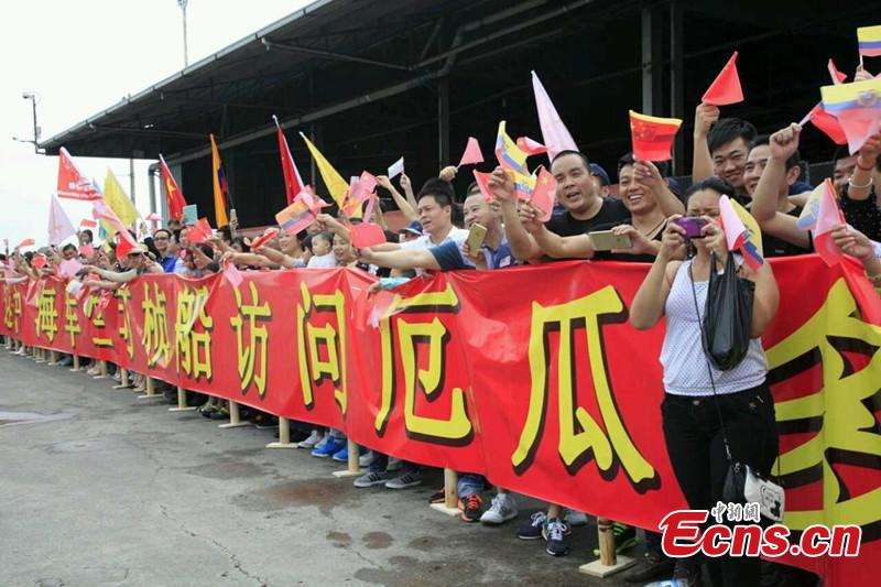 People welcome the oceanographic research ship Zhu Kezhen in Guayaquil, Ecuador, on June 7, 2015. The oceanographic research ship Zhu Kezhen of the Navy of the Chinese People's Liberation Army (PLA) on a mission of global voyage made a call at Guayaquil Port on Sunday for a five-day goodwill visit to Ecuador. (CNS photo/Yang Xinming)