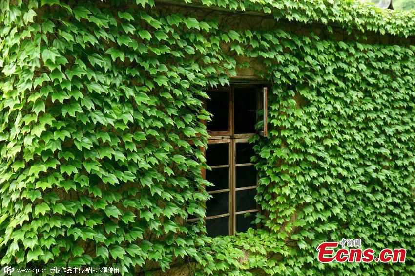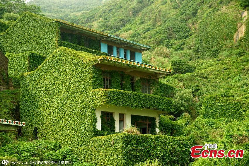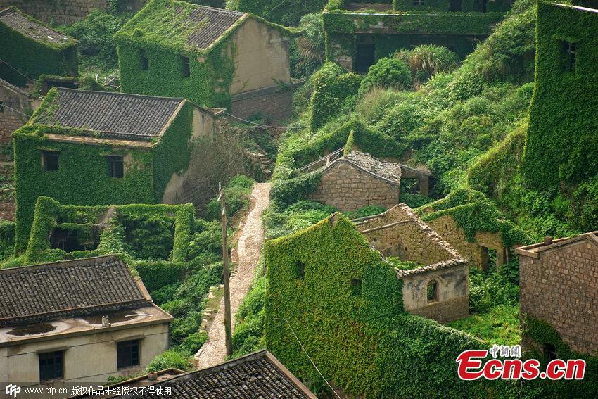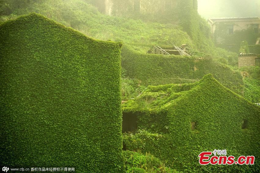 Houses covered with tendril climbing plants are seen on a deserted village in Zhoushan, East China’s Zhejiang province on May 31, 2015. The former fishing village has been reclaimed by nature after its villagers move out. (Photo/CFP)