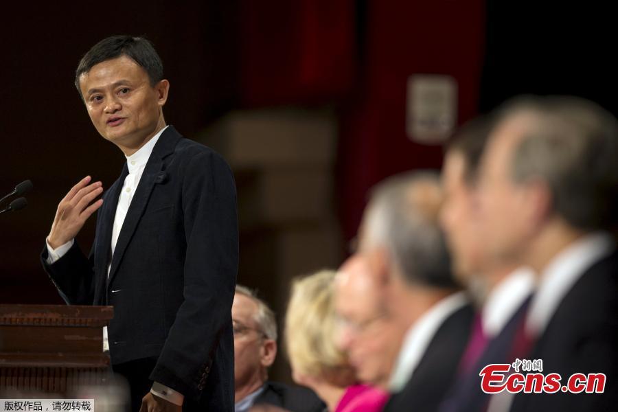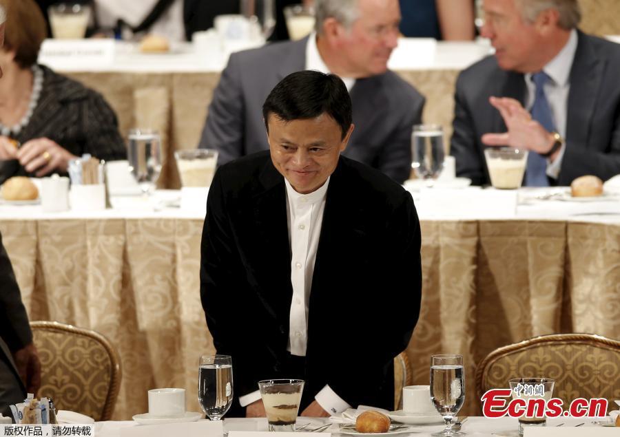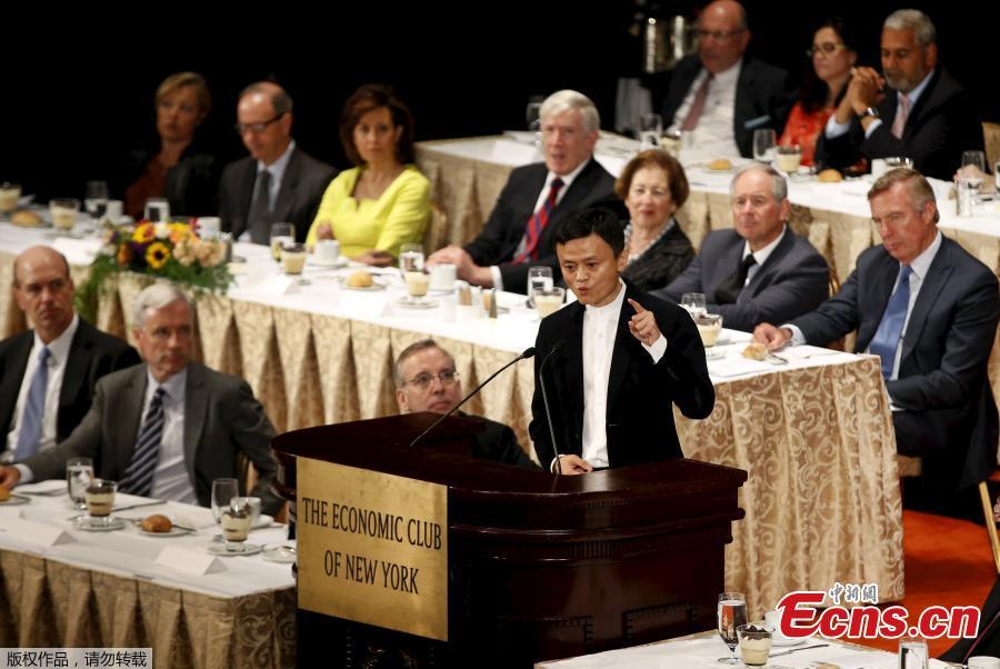 Jack Ma, Founder and Executive Chairman of Chinese e-commerce titan Alibaba Group addresses the Economic Club of New York at the Waldorf Astoria Hotel in the Manhattan borough of New York City, June 9, 2015. Alibaba does not want to fight for US market share but instead hopes to help small US businesses sell more goods in China, Jack Ma said. (Photo provided to China News Service)