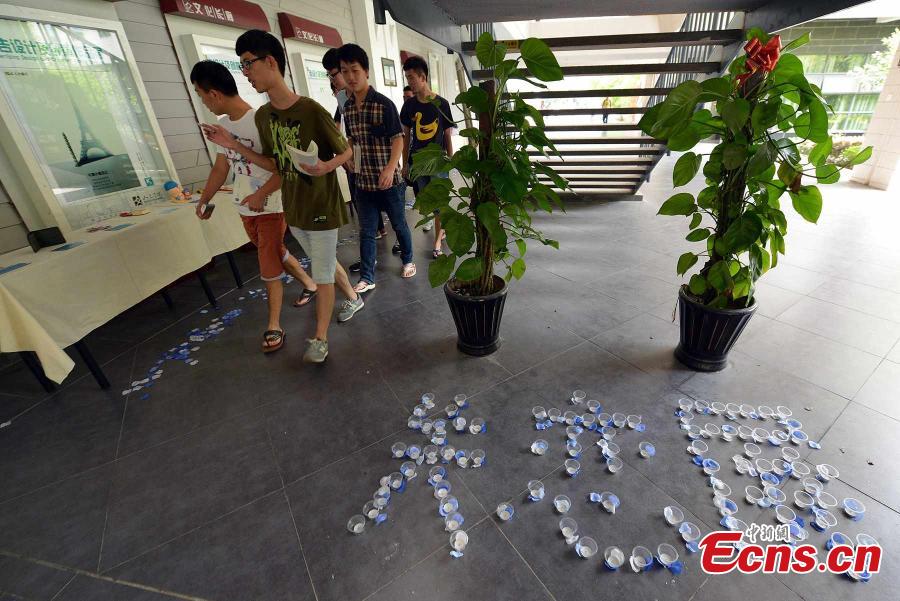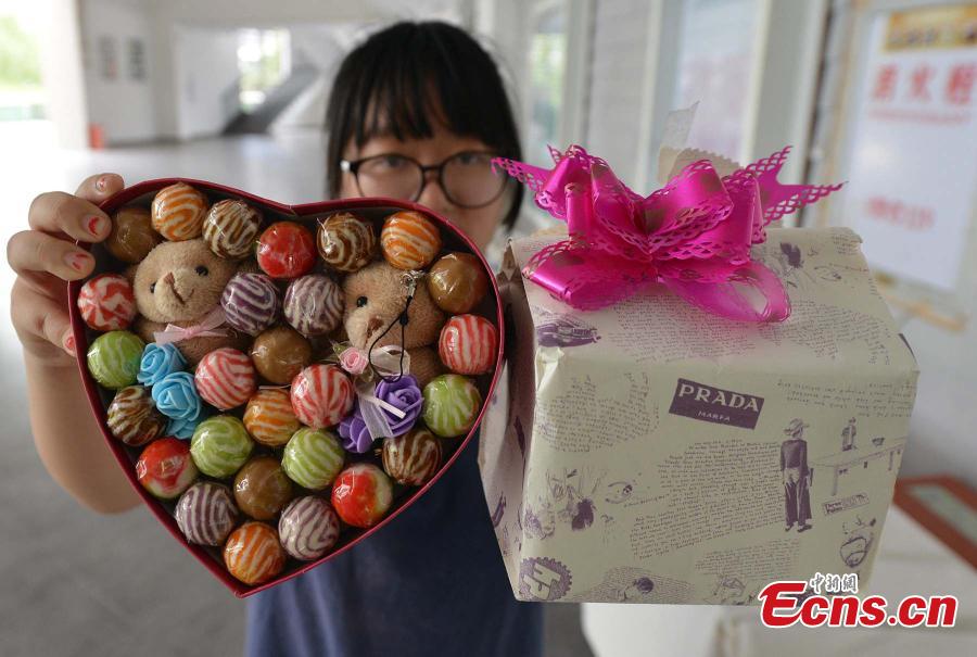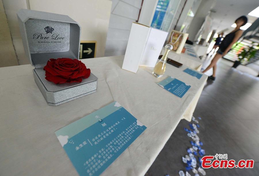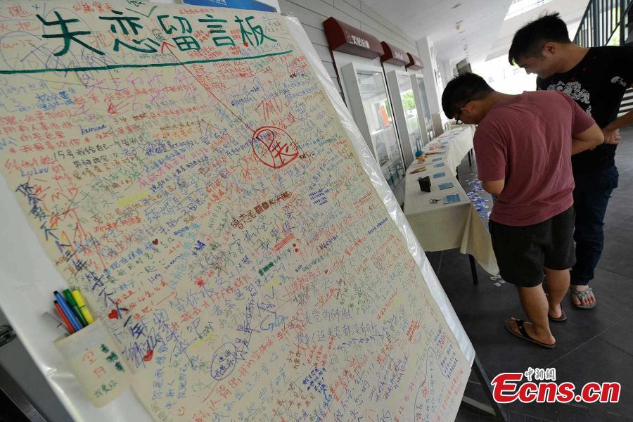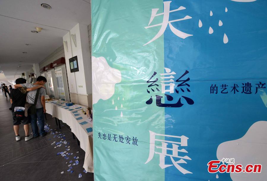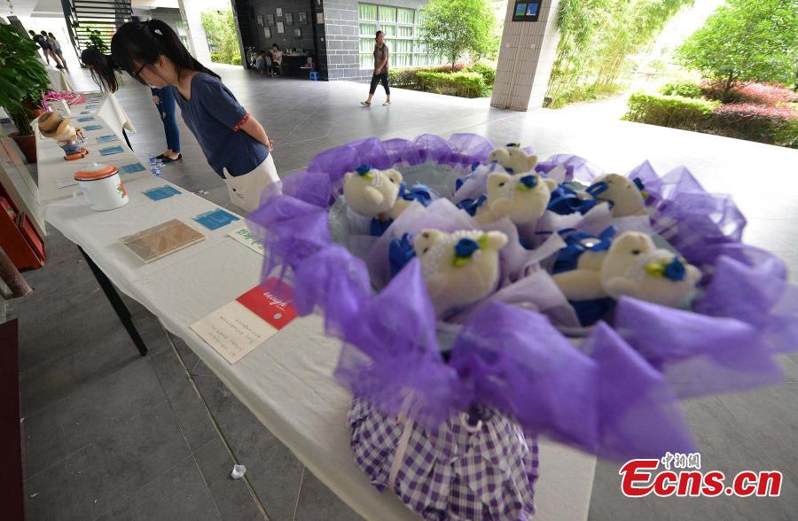 Students hold an exhibition themed on remnants of lost love at the Fujian University of Technology in Fuzhou city, capital of East China’s Fujian province, June 9, 2015. Six female students living in the same dorm collected 76 items from students who experienced breakups, such as watches, perfume, tickets, dolls and love letters. (Photo: China News Service/Zhang Bin)