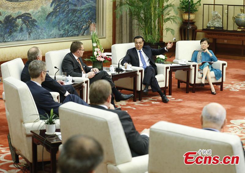 Chinese Premier Li Keqiang (2nd R) meets with representatives attending the 3rd round table summit of the Global CEO Council in Beijing, capital of China, June 9, 2015. (CNS photo/Du Yang)