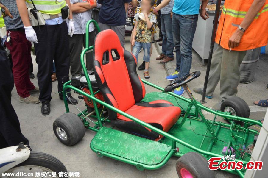 Police stop a go-kart on a trunk road in Zhenjiang city, East China’s Jiangsu province, June 9, 2015. The vehicle goes too fast, is unsafe and could cause an accident, police say. (Photo/IC)