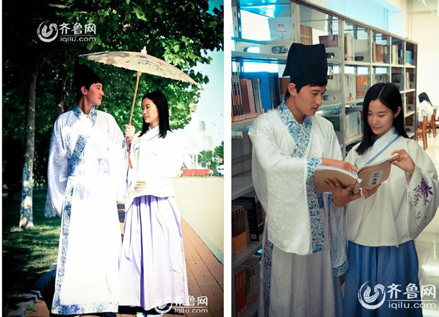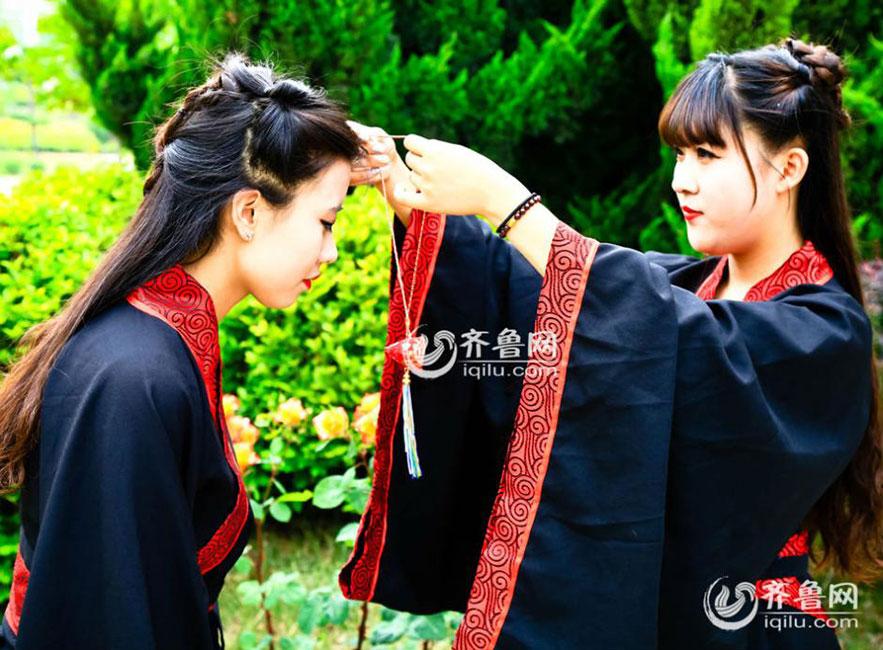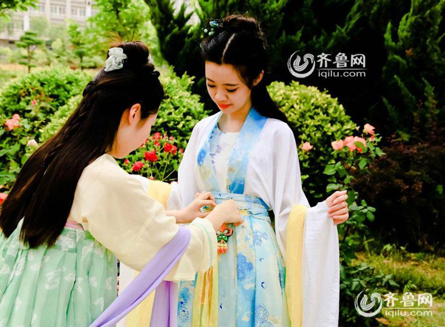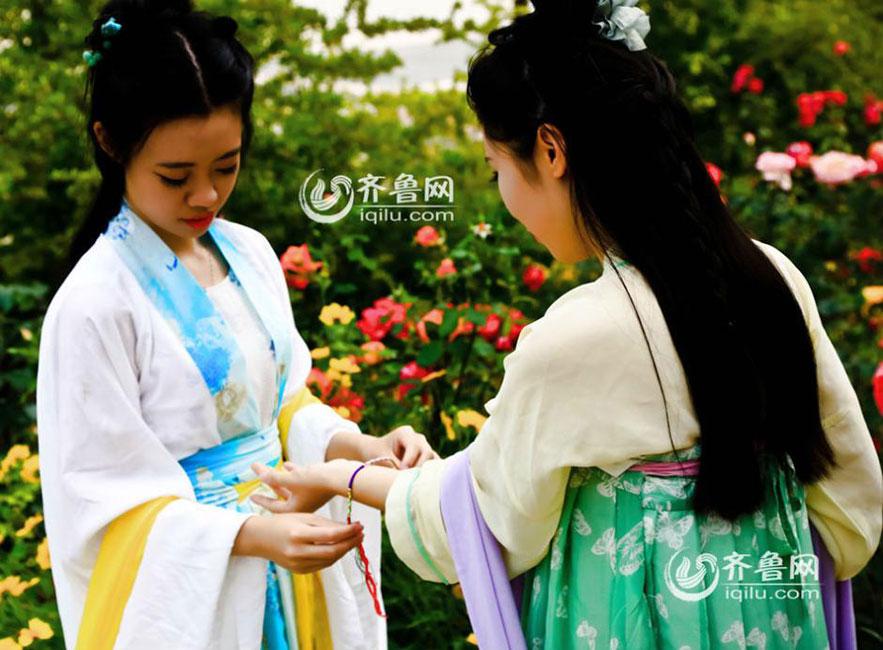 Several students of Shandong Business Institute celebrated the upcoming Dragon Boat Festival with a Hanfu show. They took a series of photos, presenting the sachets, five-colored ropes and traditional Han Chinese Clothing. (Photo/Iqilu.com)