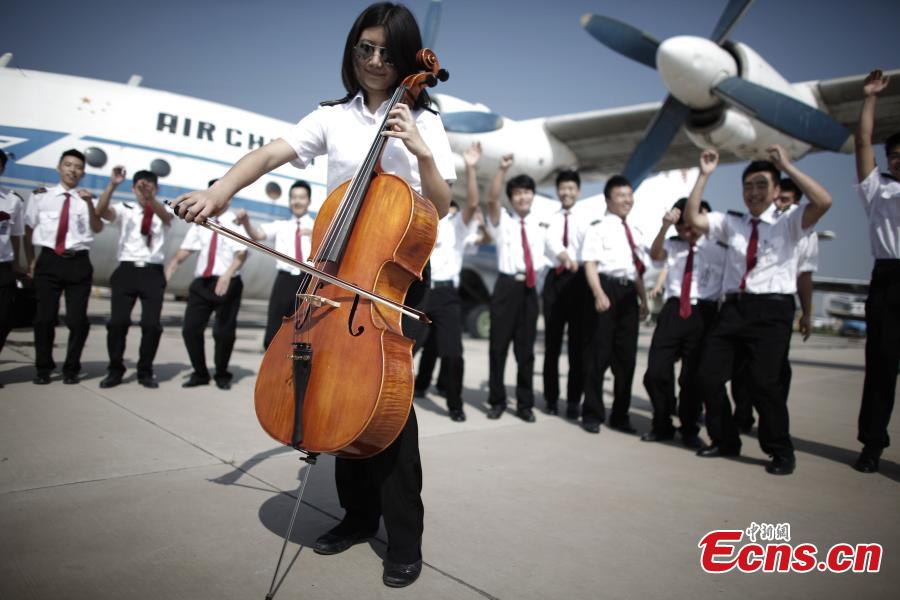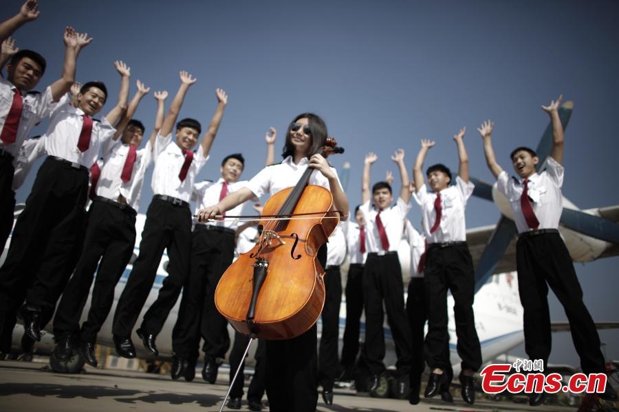 Graduates of the Civil Aviation University of China pose for a graduation photo in Tianjin, June 11, 2015. The graduates include three female pilots. (Photo: China News Service/Tong Yu)