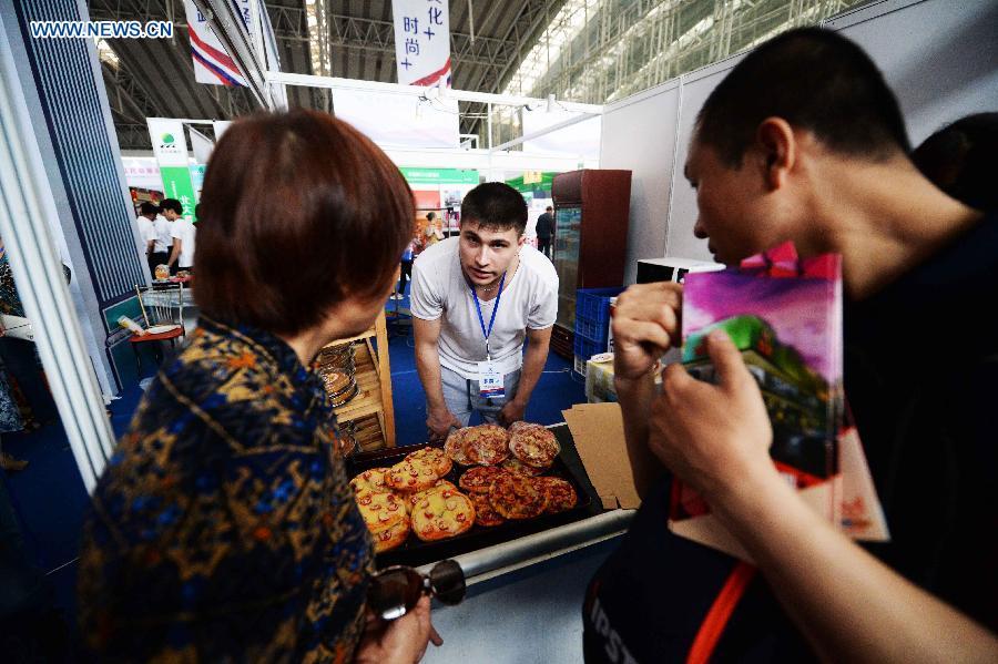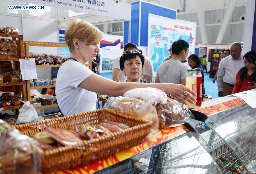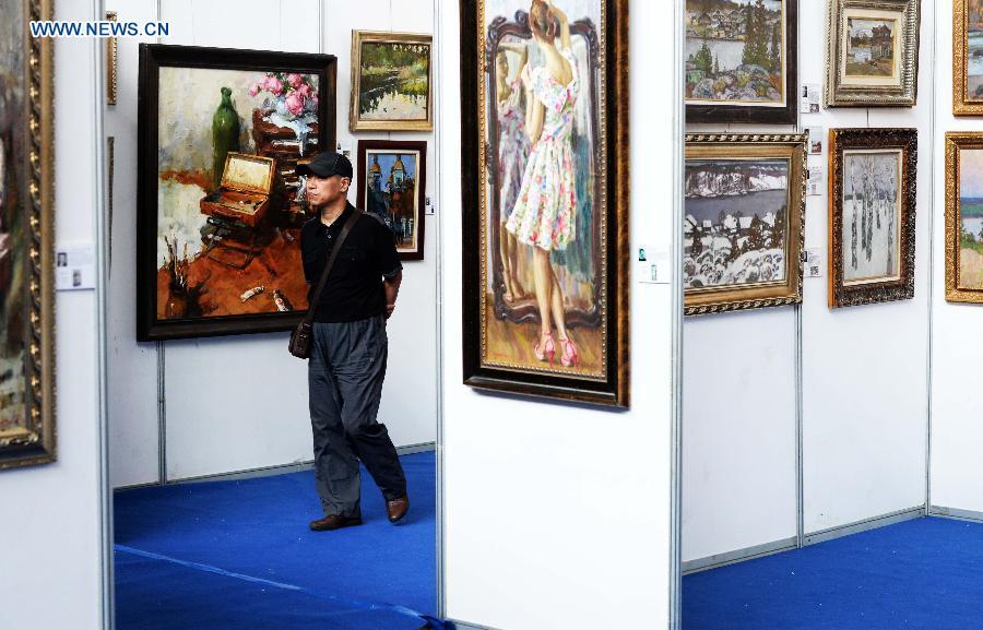 A man enjoys oil paintings during the 2015 China-Russia Cultural Exhibition in Harbin, capital of northeast China's Heilongjiang Province, June 11, 2015. (Photo: Xinhua/Wang Kai)