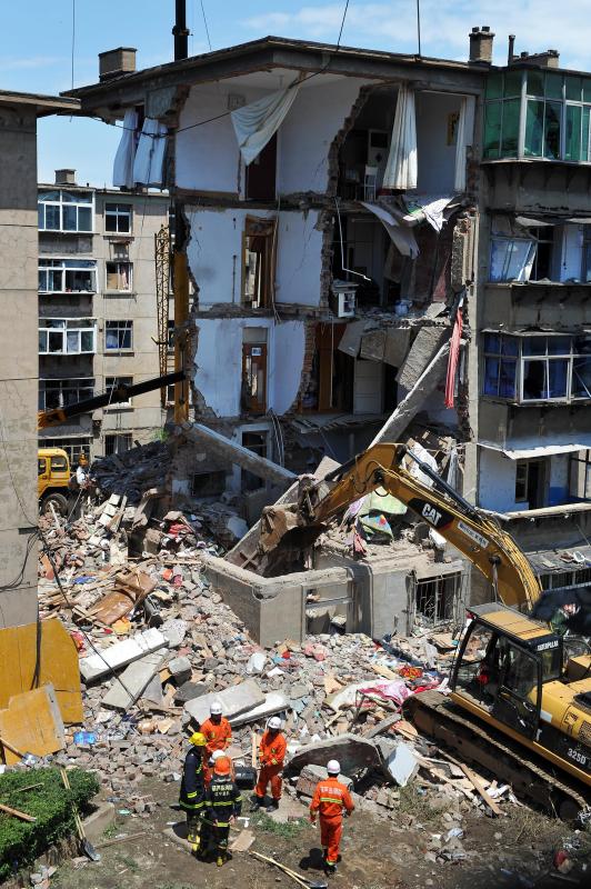 Rescuers work at the accident scene where an explosion took place in Huludao City, northeast China's Liaoning Province, June 12, 2015. One person died and two others are missing after an explosion ripped through a residential building on Friday morning in Huludao. Nine residents have been rescued from the rubble and a dozen injured, including three pedestrians, have been hospitalized. The explosion was suspected to be caused by liquified gas leak. (CNS photo/Sun Haosheng)