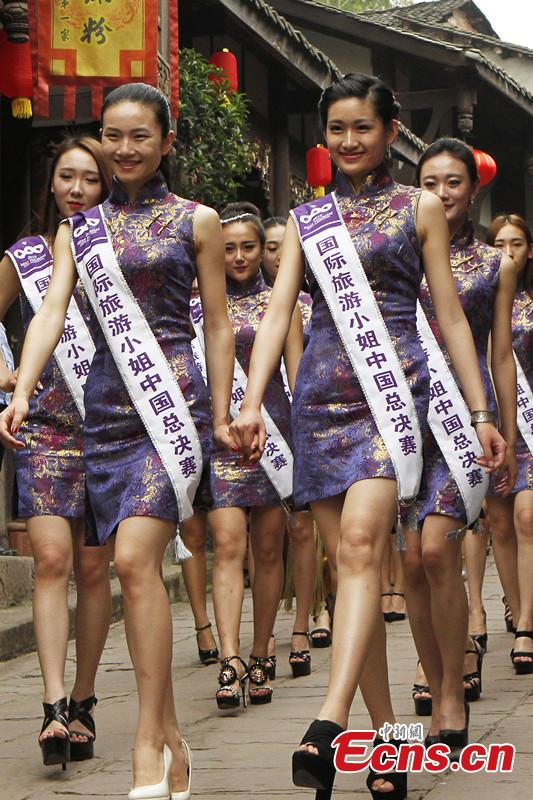 Contestants of the 2015 Miss Tourism Queen International of China division pose for pictures in Anju ancient town of southwest China's Chongqing Municipality, June 12, 2015. More than 50 contestants will compete in a series of individual events which would begin on Friday and China final on June 21 in Anju ancient town. (CNS photo/ Qian Xingqiang)