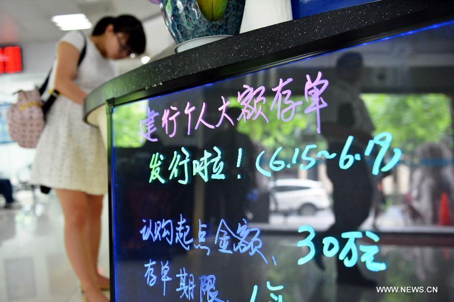 A depositor opens an account of certificates of deposit (CDs) at a division of China Construction Bank in Hangzhou, capital of east China's Zhejiang Province, June 15, 2015. Nine banks, including the "big four" state-owned lenders, started issuing the country's first batch of large-scale CDs on June 15. Much of the first batch will have terms of one year or less. The subscription threshold for individual investors is 300,000 yuan (about 49,020 U.S. dollars) while that for institutions is 10 million yuan. (Photo: Xinhua/Long Wei)