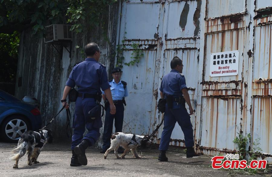 Policemen conduct an operation at an abandoned studio of Asia Television in Hong Kong’s east-coast district of Sai Kung, June 15, 2015. Local police detained at least nine suspects after explosives were discovered at the site. (Photo: China News Service/Zhang Yu)