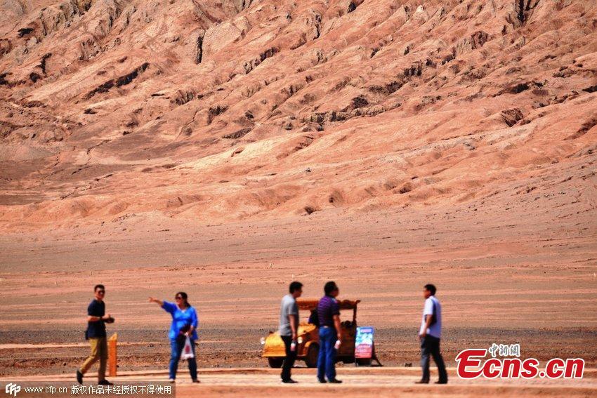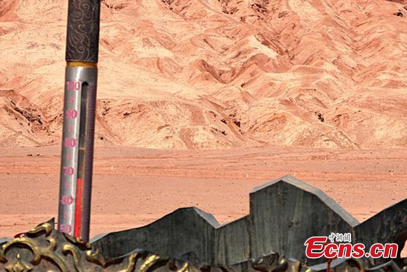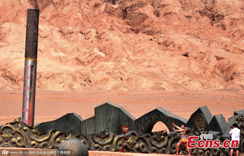 A thermometer shows the land surface temperature reaching 68 degrees Celsius at the Flaming Mountains scenic spot in eastern Xinjiang Uyghur autonomous region, June 14, 2015. Local weather bureau has issued an orange alert against high temperatures while more 3,000 tourists visited the site on Sunday. (Photo/CFP)