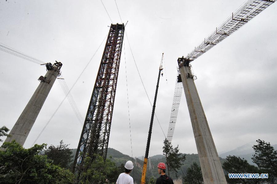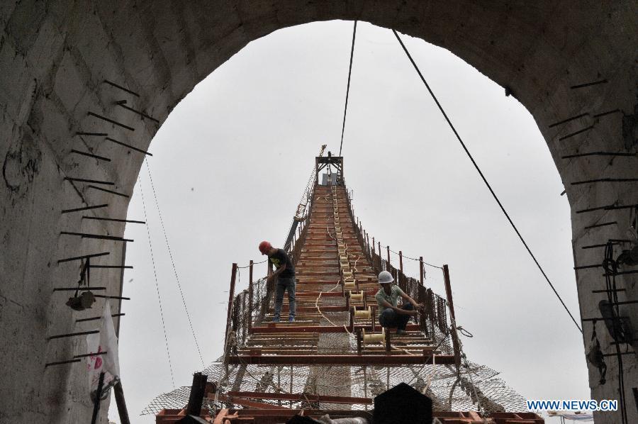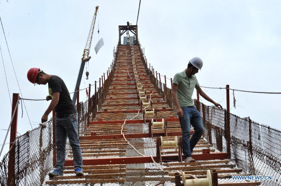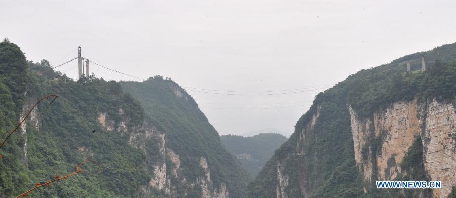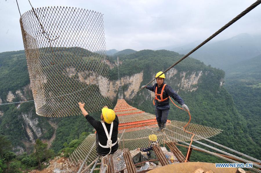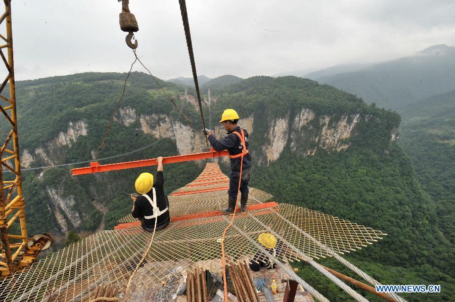 Workers build the vitreous bridge above the grand canyon in Zhangjiajie, central China's Hunan Province, June 15, 2015.A giant new vitreous bridge is currently under construction across the 400-meter deep Zhangjiajie Grand Canyon in Hunan province. The bridge will stretch 430 meters between its support pillars, making it a new scenic spot for tourism in the world. (Photo: Xinhua/Long Hongtao)