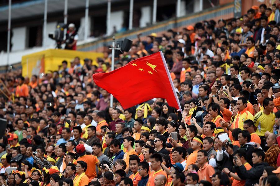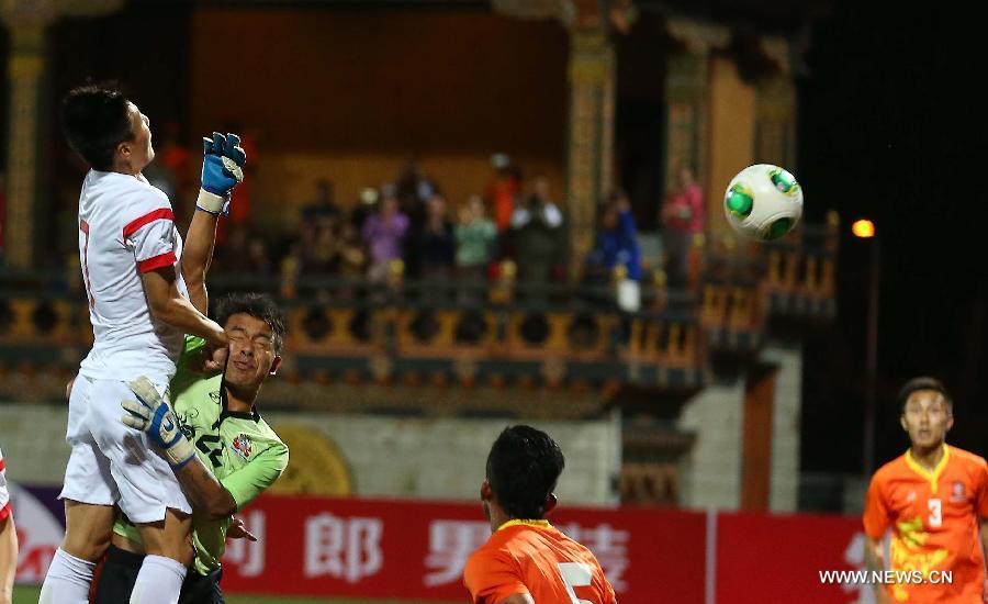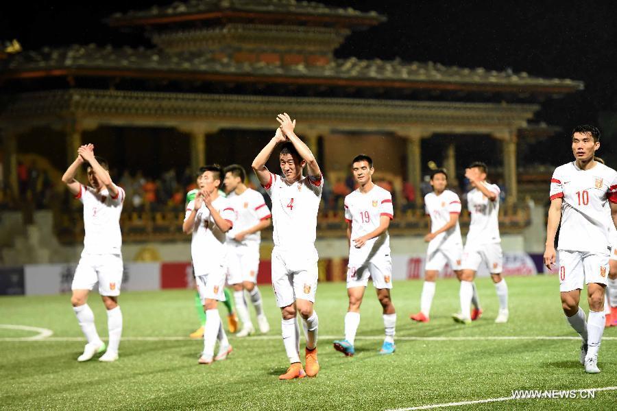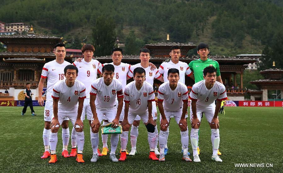 Players of China line up for photograph before the 2018 FIFA World Cup football qualifying match between China and Bhutan in Thinphu, capital city of Bhutan, on June 16, 2015. (Photo: Xinhua/Cao Can)