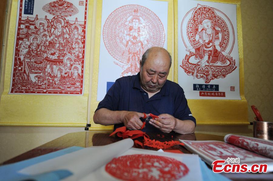 Folk artist Chen Yijiang makes a paper cutting work in Lanzhou, capital of Northwest China’s Gansu province, June 16, 2015. Chen, 72, developed an interest in paper cutting at an early age. He has visited the Mogao Grottoes in Dunhuang for many times at his own expense to draw inspiration from the murals and also created a large number of paper cutting works themed on the UNESCO World Heritage Site. (Photo: China News Service/Yang Yanmin)
