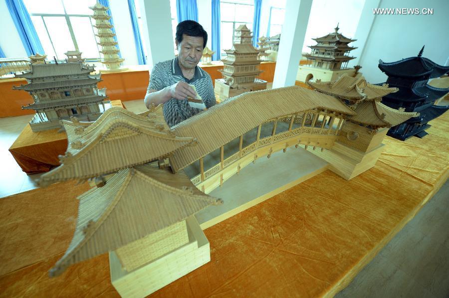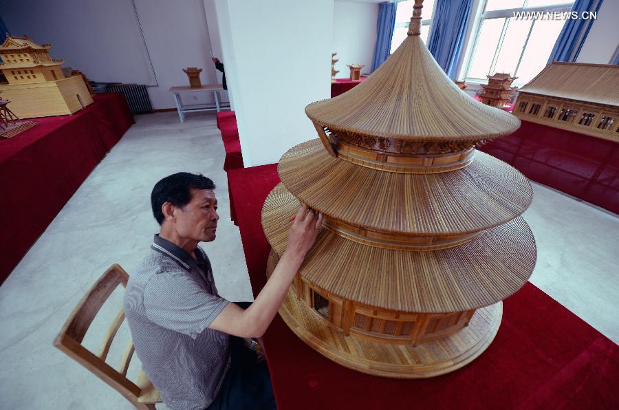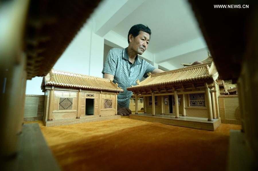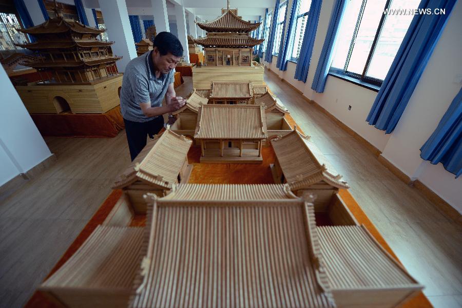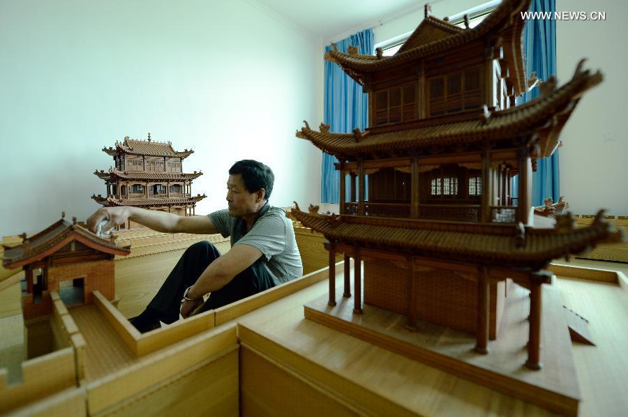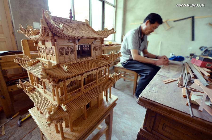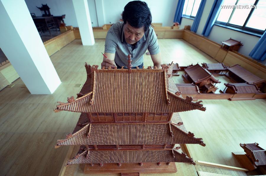 Ding Wuming carves a miniature Chinese building at his studio in Lanzhou, capital of northwest China's Gansu Province, June 17, 2015. Ding Wuming was born in a carpenter family and began to learn woodworking since 17 years old. To preserve the skill of ancient Chinese architecture, Wu and his 7 apprentices built more than 90 miniature buildings. (Photo: Xinhua/Fan Peishen)