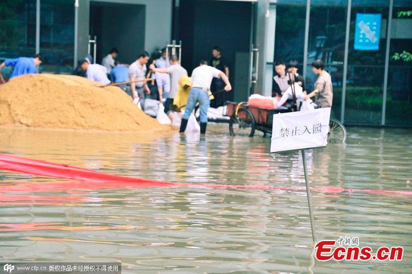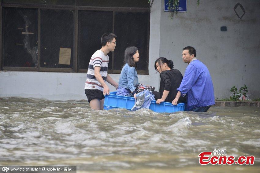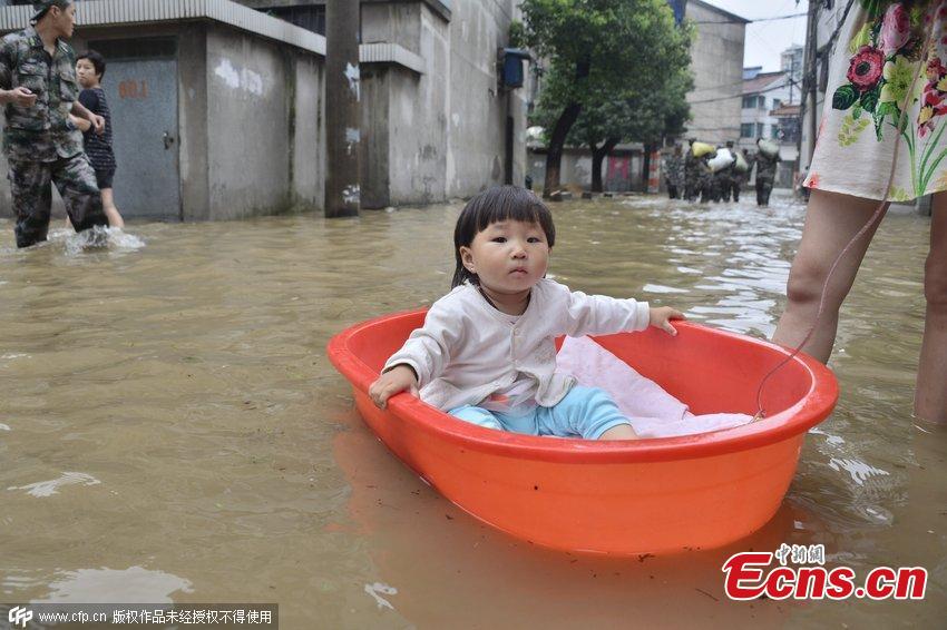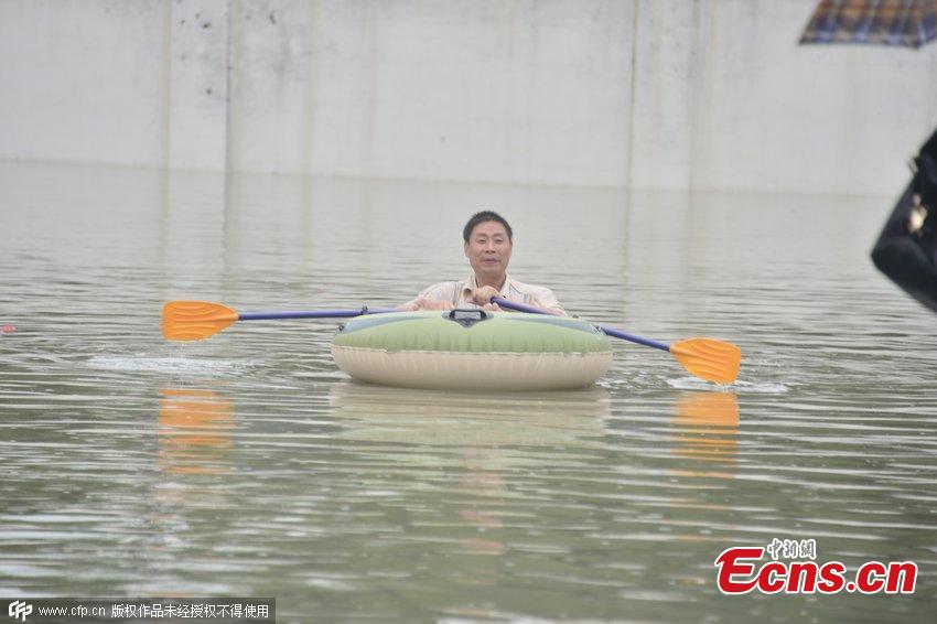 A man rows a rubber boat on a flooded street after ten hours of heavy rainfall in Changzhou city, East China’s Jiangsu province, June 17, 2015. (Photo/CFP)