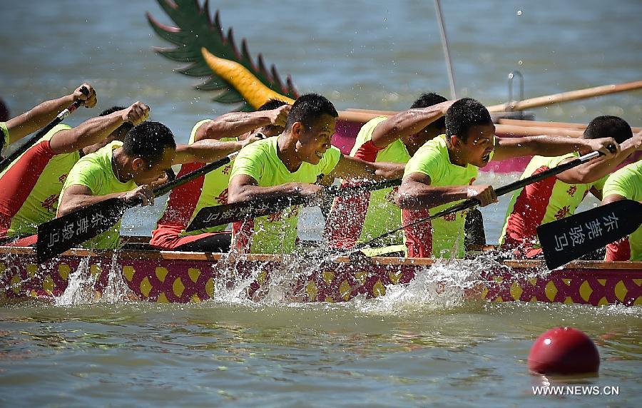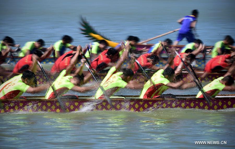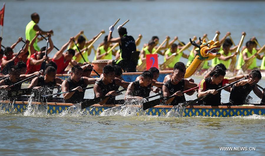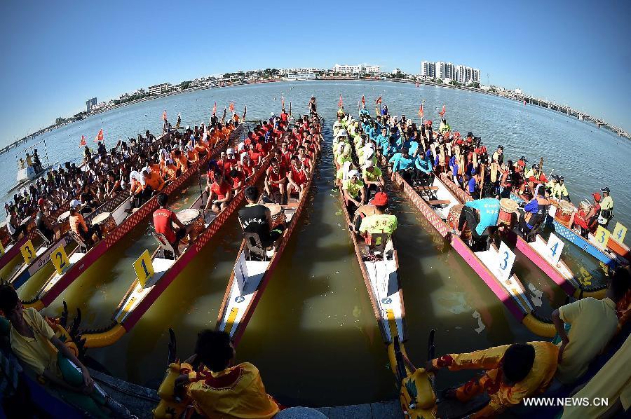 Participants wait for the start of a dragon boat competition in Chengmai, a county in south China's Hainan Province, on June 18, 2015. Twenty-four teams from all over the country took part in the event to mark the Chinese traditional Dragon Boat Festival. (Photo: Xinhua/Guo Cheng)