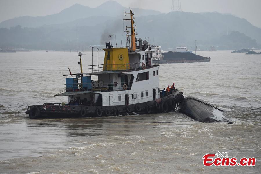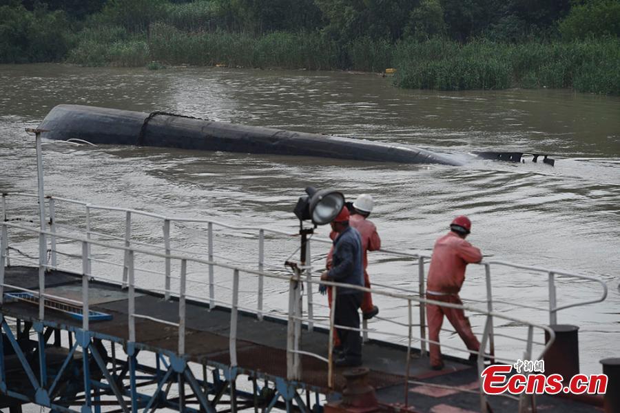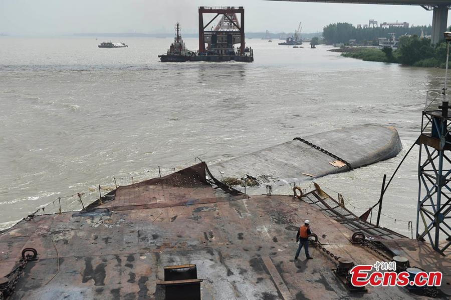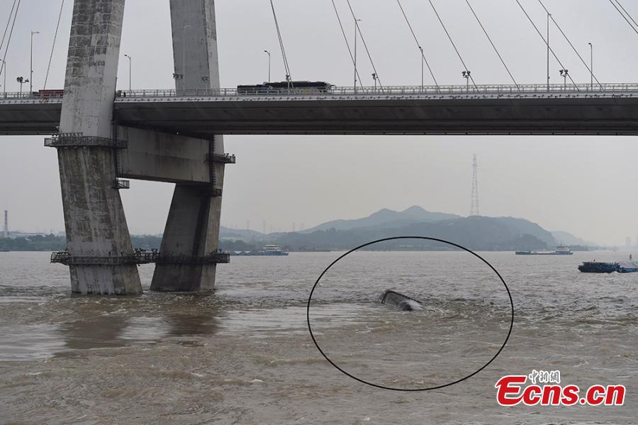 A cargo vessel capsizes in the Yangtze River in Nanjing city, capital of East China’s Jiangsu province, June 18, 2015. Two crew members onboard went missing. The vessel was carrying 280 tons of liquid caustic soda when the accident happened. (Photo: China News Service/Han Dan)