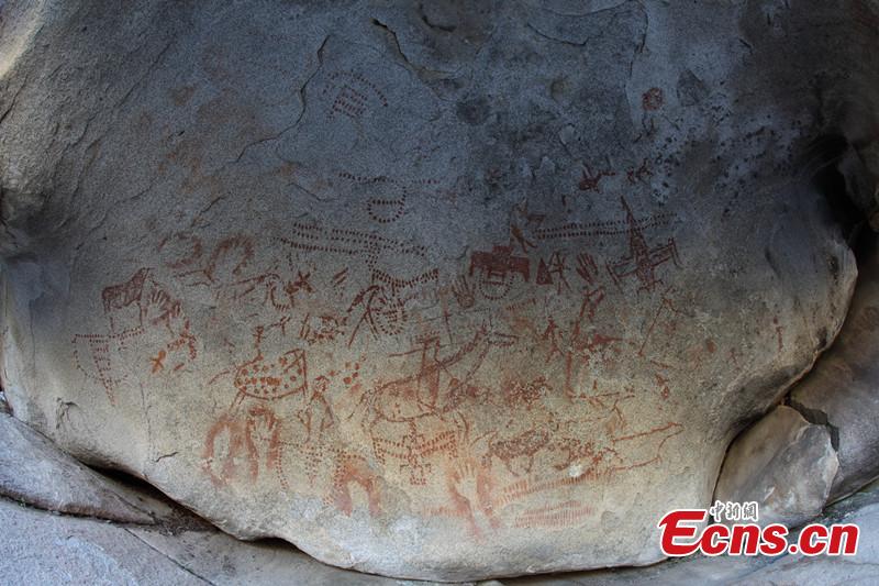 Rock carvings discovered in Duogate cave in Habahe county, Northwest China’s Xinjiang Uyghur autonomous region. Archeologists have discovered 893 rock carvings in about 20 sites around the county, with the earliest dating from around 10,000 years ago. Those petroglyphs were made at various points in time and cover a broad range of topics, such as hunting, herding, and ritual activities, and some may even resemble planes or rockets in the eyes of modern people. (Photo: China News Service/Liu Shihe)