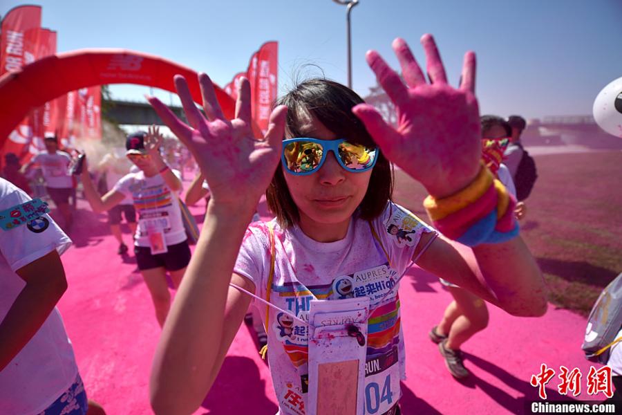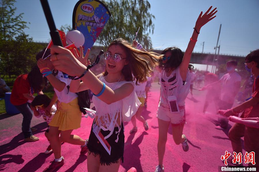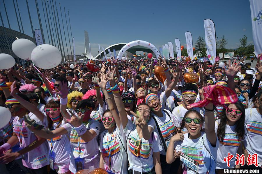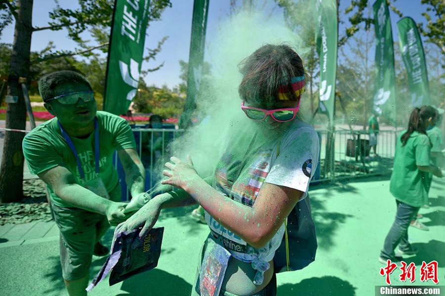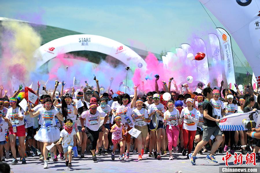 About 20,000 participants, or "color runners," take part in the "Color Run" event, a five-kilometer, un-timed race that kicks off at Beijing Fengtai Garden Expo Park in the Fengtai District of Beijing on June 20, 2015. Some color runners use the opportunity to show their support for Beijing's bid for the 2022 Winter Olympic Games. (Photo: Chinanews.com/Jin Shuo)