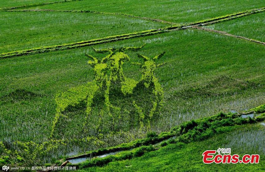 3D images are created on a rice paddy field in Xibe town in Shenyang city, Northeast China’s Liaoning province, June 22, 2015. China’s Xibo ethnic group has a tradition of making patterns on paddy fields. A total of 13 3D images, covering an area of 150 mu (10 hectares), featured themes of Chinese dream, animals, and celebrities. Rice field art is made by using different colors and types of rice to create a giant picture on a paddy field. (Photo/CFP)