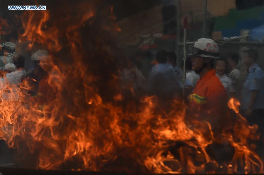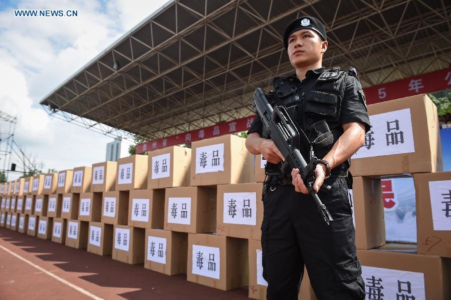 A police officer prepares to destroy drugs in Guiyang, capital of southwest China's Guizhou Province, June 23, 2015. The local police destroyed more than 1,200 kilograms of drugs on Tuesday, three days ahead of the International Day Against Drug Abuse and Illicit Trafficking. (Photo: Xinhua/Ou Dongqu)