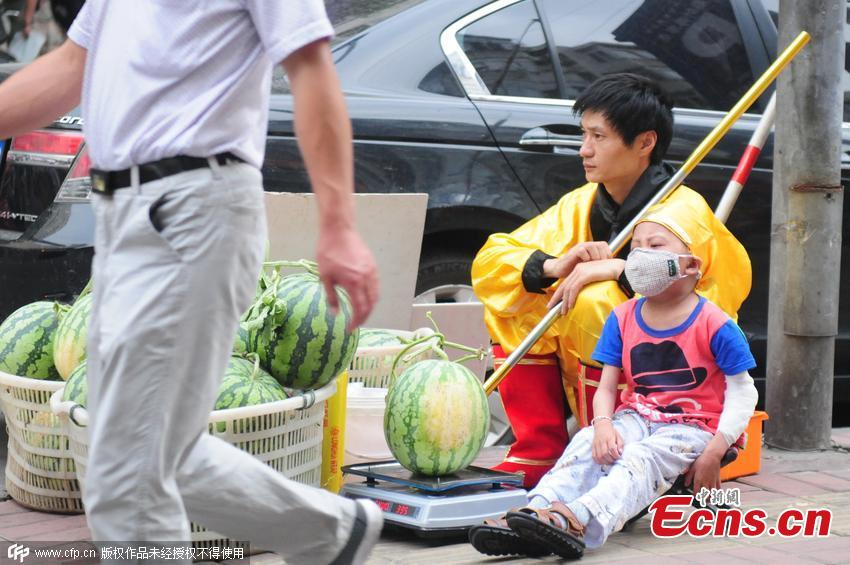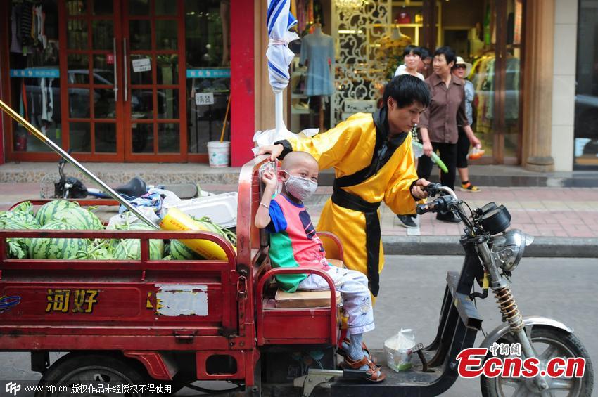 Zhu Keliang dressed as the Monkey King, a character from the Chinese classical novel "Journey to the West", sells watermelons with his son on a street in Hefei, East China’s Anhui province. Zhu wears the costume to attract more customers and raise money for medical treatment for his son who suffers from leukemia. (Photo/CFP)