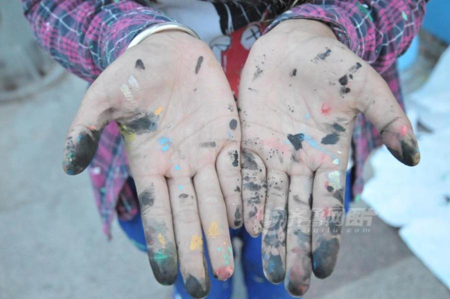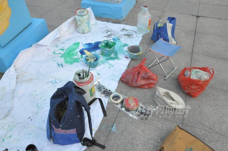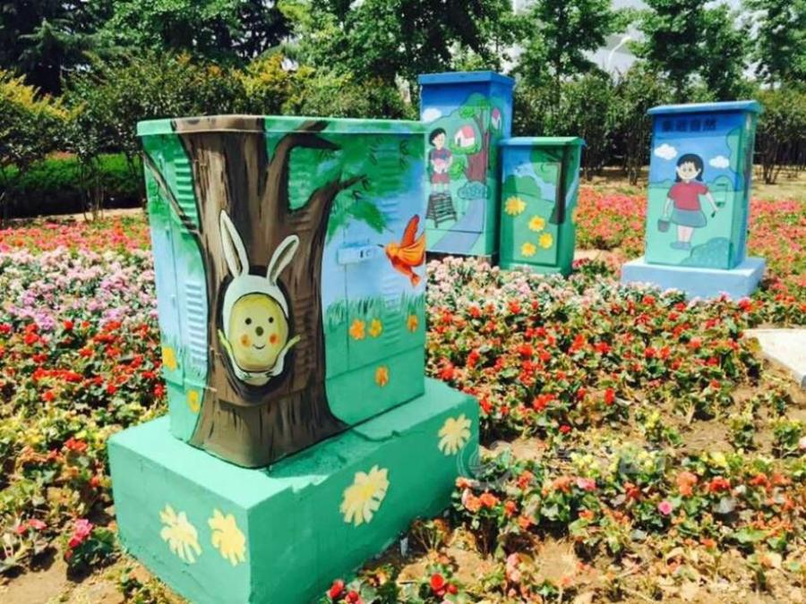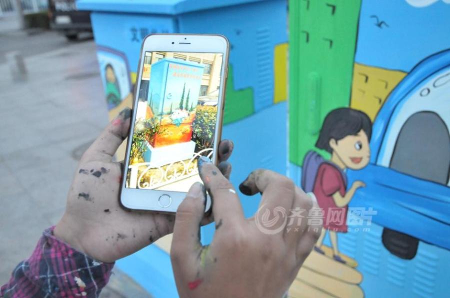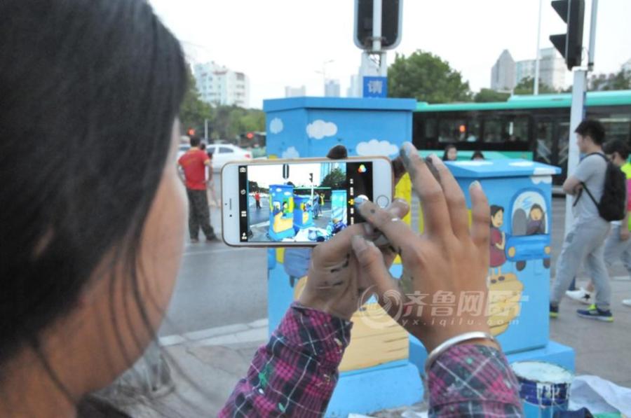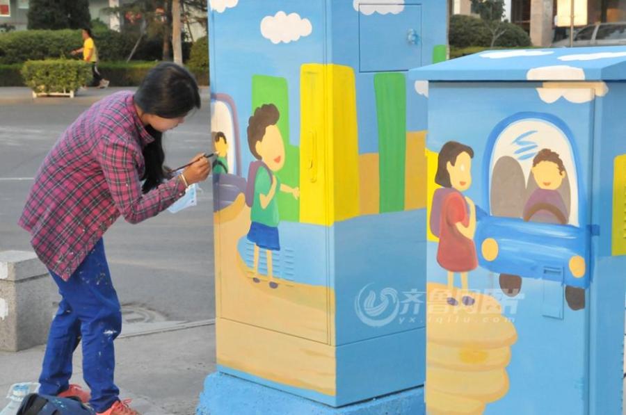 Liu Guanglin paints on a street in Qingdao city, East China’s Shandong province. Liu, who graduated from an art school of Qingdao University, has been invited to paint things like dustbins and electricity meter boxes by the local government, who launched a campaign to clean up the environment. (Photo/iqilu.com)