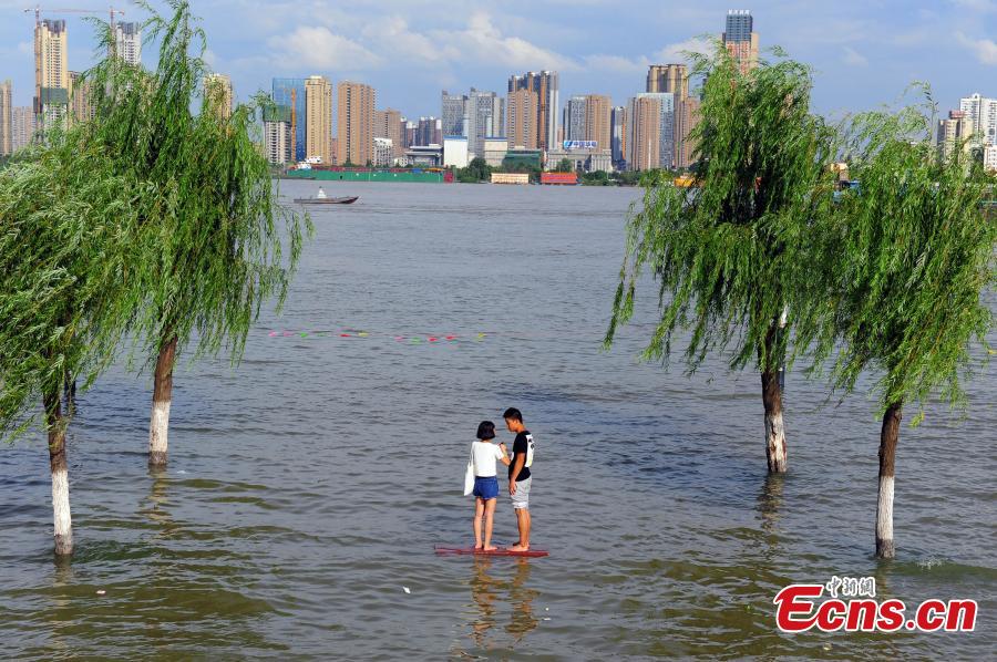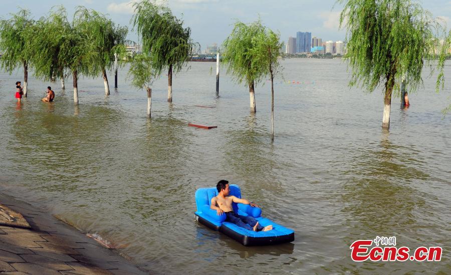 Residents enjoy the cool water on a submerged platform by the Yangtze River in Wuhan city, capital of Central China’s Hubei province, June 24, 2015. The city recorded temperature highs over 30 degrees Celsius. (Photo: China News Service/Zhang Chang)