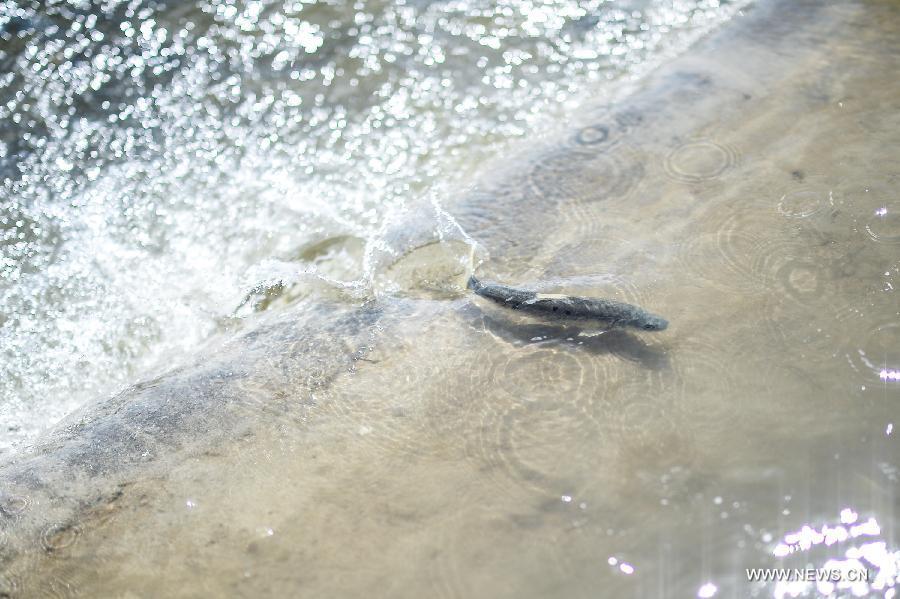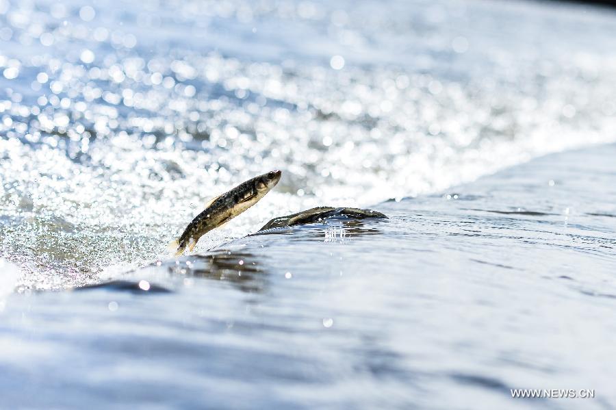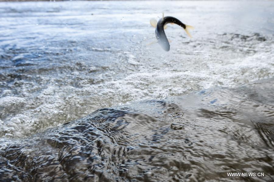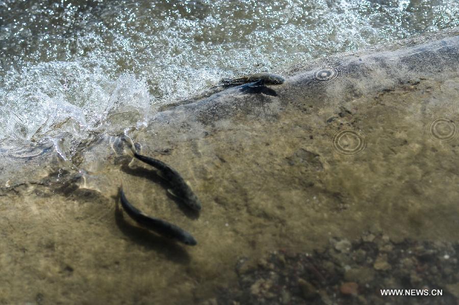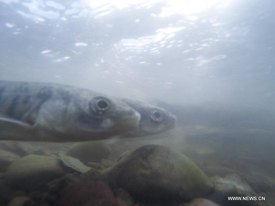 Adult migratory naked carps (Gymnocypris przewalskii), a kind of rare carps, are seen during the spawning season in the Shaliu river around Qinghai Lake, northwest China's Qinghai Province, June 23, 2015. (Photo: Xinhua/Wu Gang)