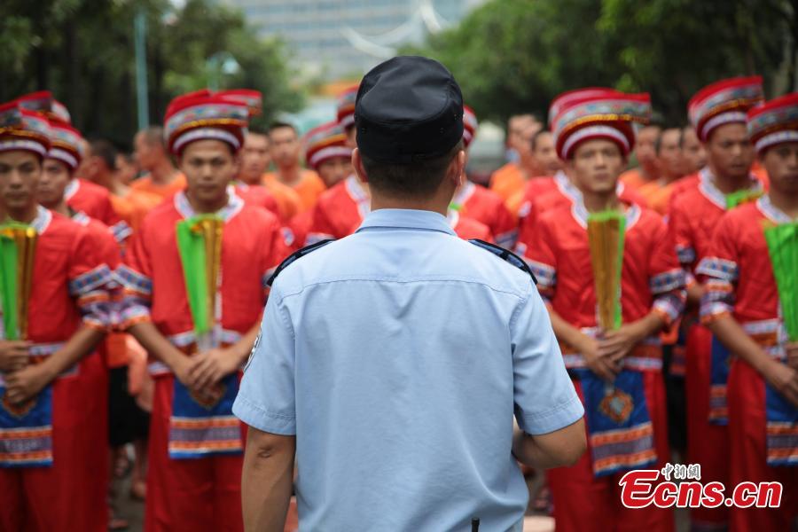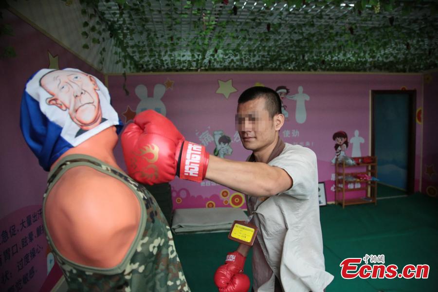 A drug addict punches a mannequin for stress relief at a rehabilitation center in Nanning city, capital of Southwest China’s Guangxi Zhuang autonomous region, June 25, 2015. Guangxi has paid more attention to the psychological issues faced by drug addicts and has organized diverse rehabilitation programs that include an “anger room” to aid relaxation, performance therapy and counseling. (Photo: China News Service/Wang Gang)