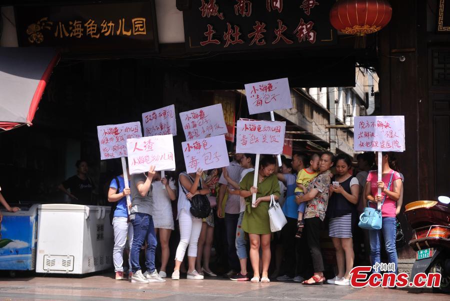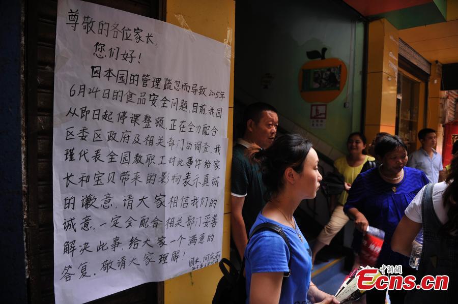 People gather outside a kindergarten closed down for providing potentially dangerous food to children in Southwest China’s Chongqing municipality, June 25, 2015. The kindergarten’s breakfast included steamed buns stuffed with rotten meat. All the children have been sent to a hospital for a check-up. (Photo: China News Service/Chen Chao)