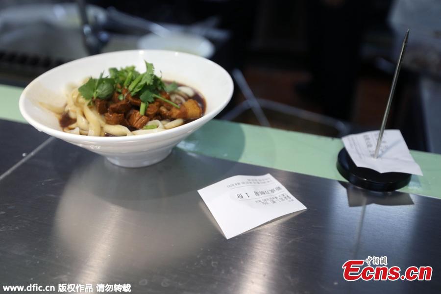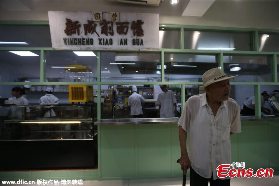 A customer stands in the reopened Xincheng Noodle House in downtown Beijing, June 25, 2015. The 60-year-old restaurant was closed on March 25 due to property right differences. It started as a private noodle house and was then nationalized in 1956. Later, it was operated by private owners, featuring the same decor, products and even staff for decades, and became a mainstay in Qianmen, where many historic buildings have been razed in recent years as part of the street's modernization. The reopened restaurant, named “Xincheng Bean Sauce Noodle House” retains its previous features and employees, and offers typical Beijing snacks. However, the price for a bowl of noodles rose from 10 yuan($1.6) to 25 yuan. (Photo/CFP)