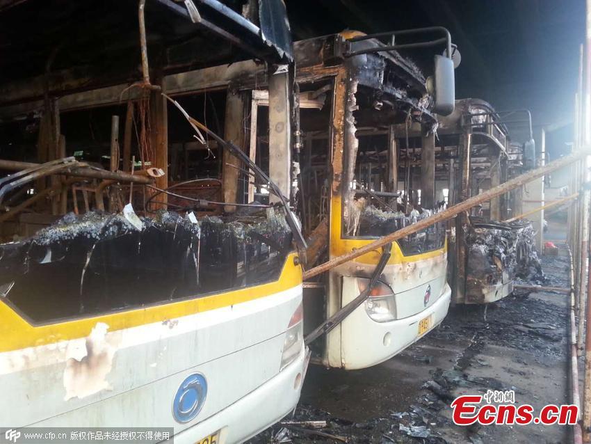 Charred bus frames are seen after a fire at a parking plot in Hengyang city, Central China’s Hunan province, June 26, 2015. The early morning blaze destroyed 10 buses and one car. Local police are trying to determine the cause of the fire. (Photo/CFP)
