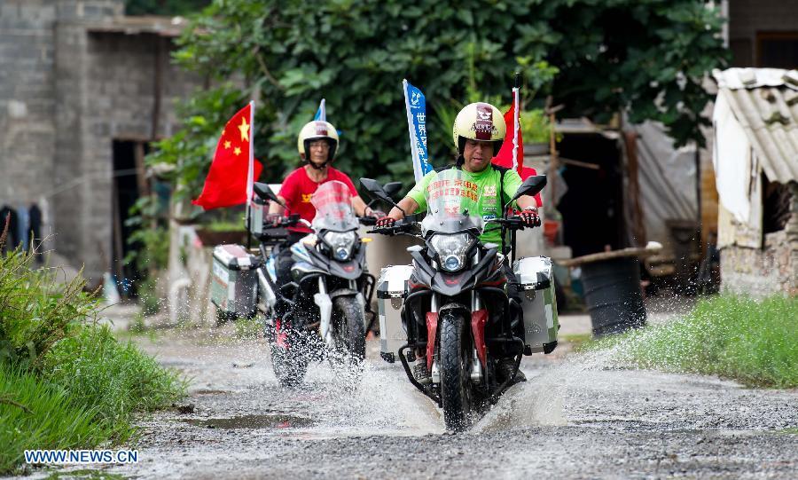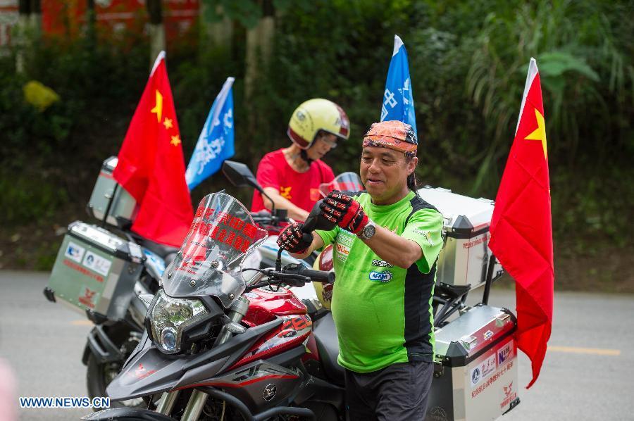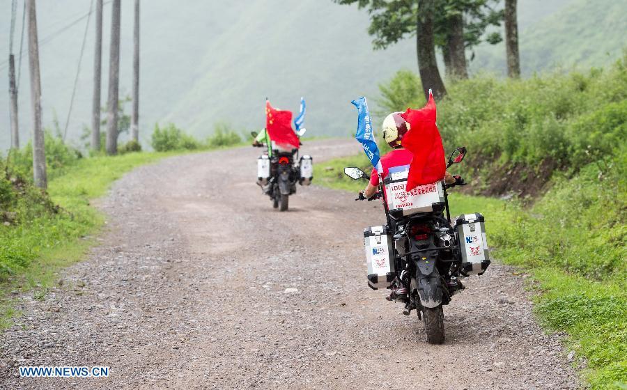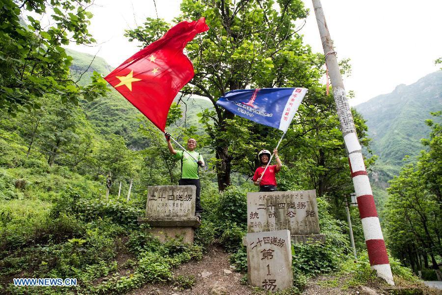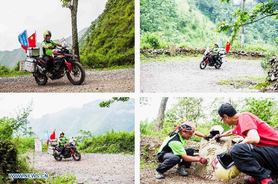 Combined photo taken on June 25, 2015 shows motorcyclists Li Yuejin and Zou Shengchang riding on a mountainous zigzag in Qinglong County, China's southwest Guizhou Province. Two motorcyclists from southwest China's Chongqing, 57-year-old Li Yuejin and 63-year-old Zou Shengchang, challenged the mountainous zigzag, also called 24-zig, on Thursday within 30 minutes. The mountainous zigzag, a section of the famous Stilwell Road, witnessed more than 2,000 trucks fully loaded with military supplies passed by daily in World War II. Therefore, it is acknowledged as "the lifeline of the Resistance War against Japanese". (Xinhua/Liu Chan)