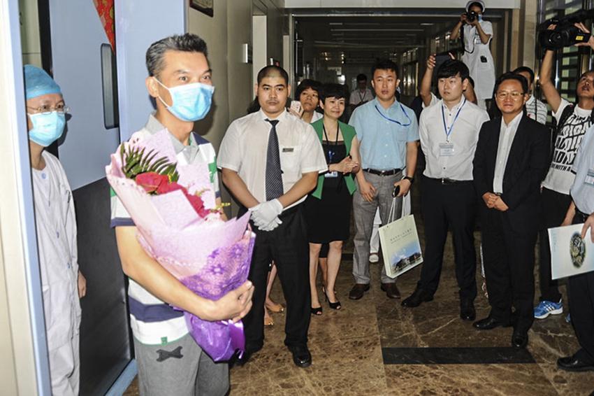 The first imported MERS patient (second from left) in China holds flowers at the hospital where he has received treatment, June 26, Huizhou, Guangdong province. The Korean patient has been healed and will go back to his own country. (CNS photo/ Zhong Xin)