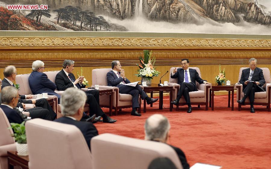 Chinese Premier Li Keqiang (R, front) shakes hands with overseas representatives who come here to attend the 4th Global Think Tank Summit, in Beijing, capital of China, June 26, 2015. (Xinhua/Zhang Duo)