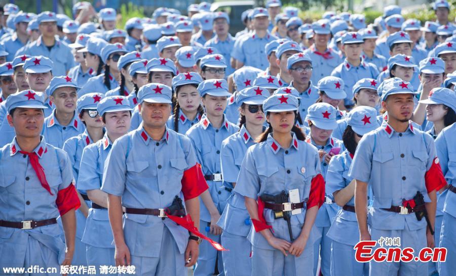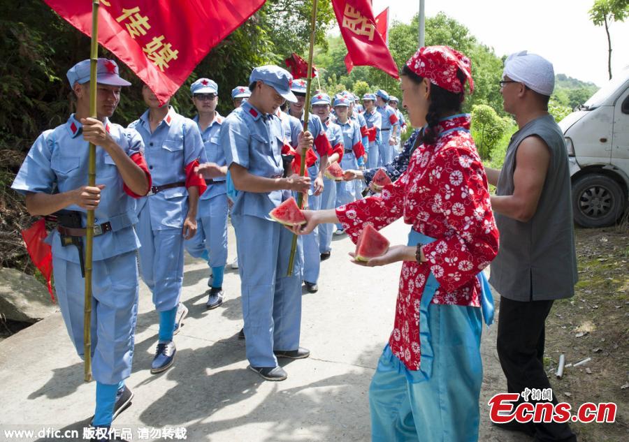 Some 300 participants wearing Red Army uniforms take the mountain road travelled by the Red Army in Wugen town, a historical revolutionary base, in Wenling city, East China’s Zhejiang province, June 27, 2015. The event, organized by Wenling Charity Federation, was part of activities to commemorate the 70th anniversary of victory in the Chinese People's War of Resistance Against Japanese Aggression. (Photo/IC)