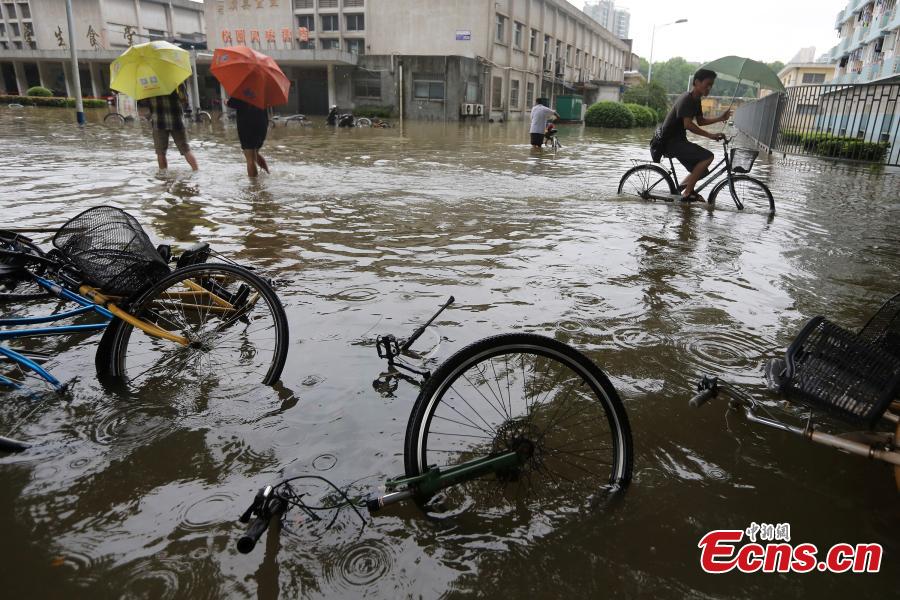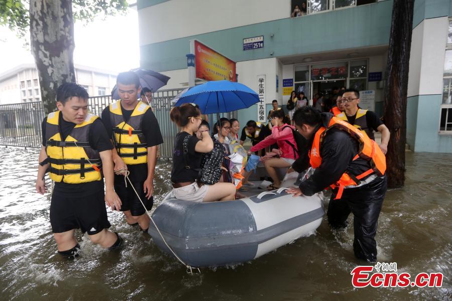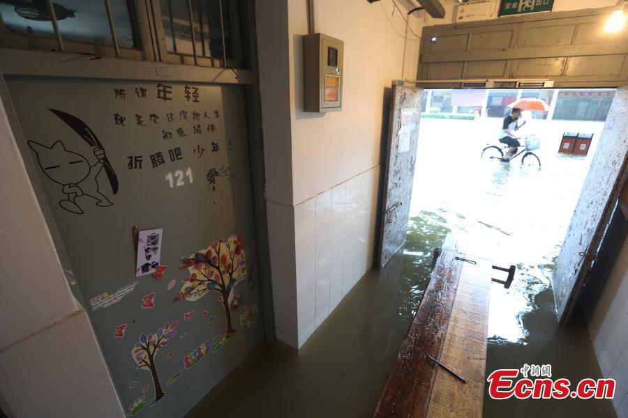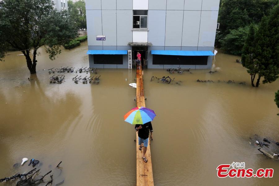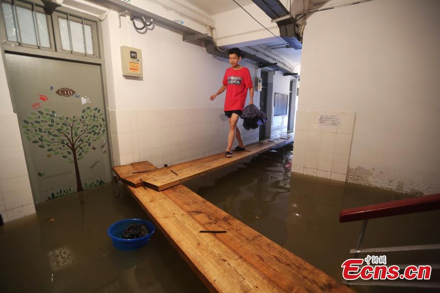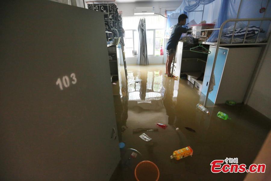 A dormitory room is flooded at Nanjing University of Science and Technology in Nanjing, Jiangsu province, June 27, 2015. Students had to walk on a floating bridge made of wooden planks. The city was hit hard by rainstorms over several days. (Photo: China News Service/Yang Bo)