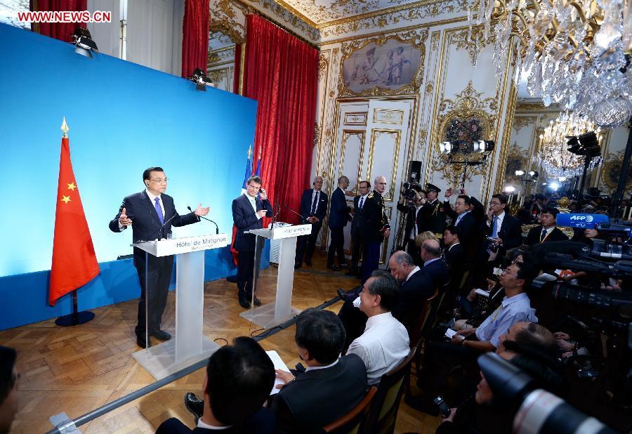 Chinese Premier Li Keqiang (L) and his French counterpart Manuel Valls attend a joint press conference after their talks in Paris, France, June 30, 2015. (Photo: Xinhua/Ma Zhancheng)