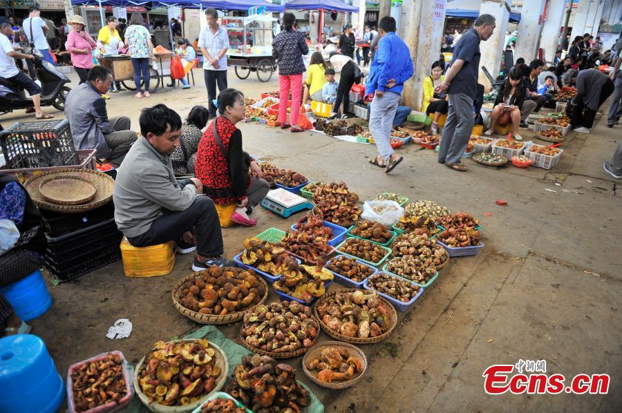 Vendors sell wild mushrooms at a market in Kunming, Southwest China’s Yunnan province, July 2, 2015. With mushroom entering the market in great quantities, prices are dropping. Mushrooms, fresh or dried, are a common ingredient in Chinese cooking. (Photo: China News Service/Liu Ranyang)