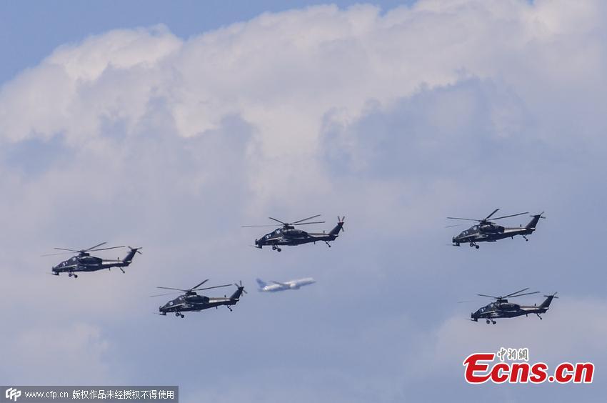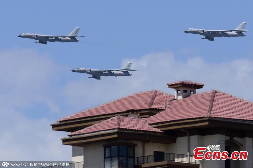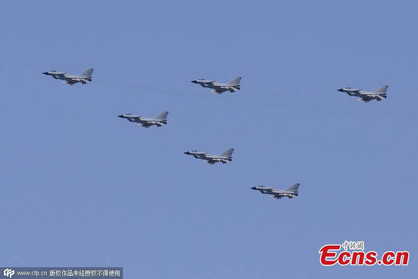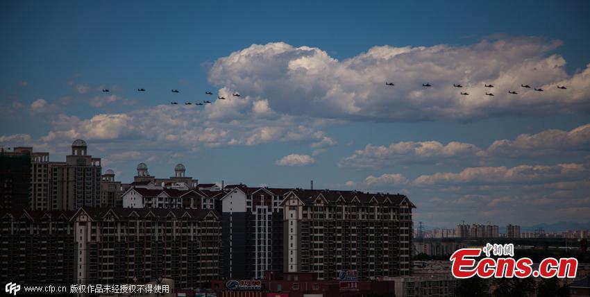 Planes of the People’s Liberation Army fly during a rehearsal for a planned military parade this year to commemorate the 70th anniversary of victory in the Chinese People's War of Resistance Against Japanese Aggression in Beijing, July 2, 2015. (Photo/CFP)