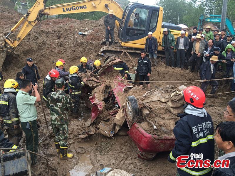 Rescuers work at the landslide site in Lanlong Village of Datong Hui and Tu Autonomous County, northwest China's Qinghai Province, July 2, 2015. Two people were killed and another was injured in the landslide happening on Thursday. (CNS photo/Hu Guilong)