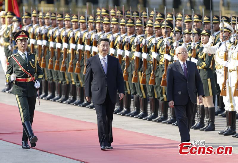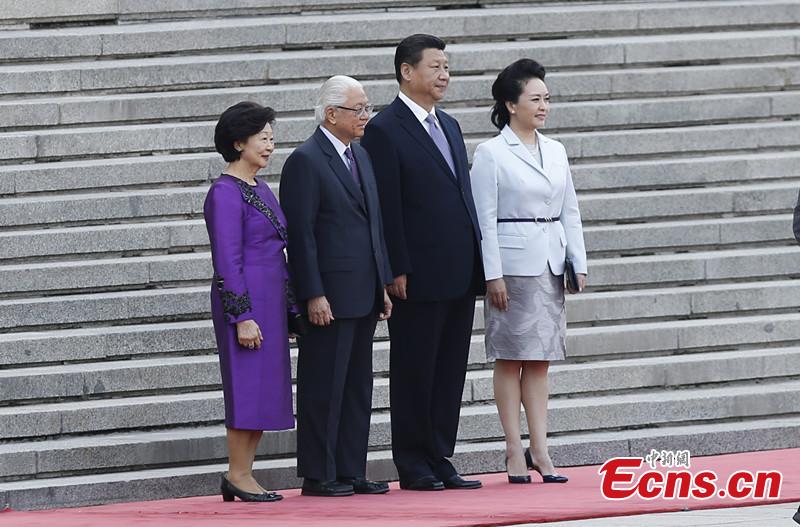 Chinese President Xi Jinping (L) holds a welcoming ceremony for Singaporean President Tony Tan Keng Yam in Beijing, capital of China, July 3, 2015. (CNS photo/Du Yang)