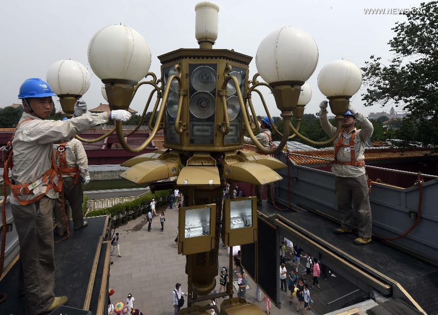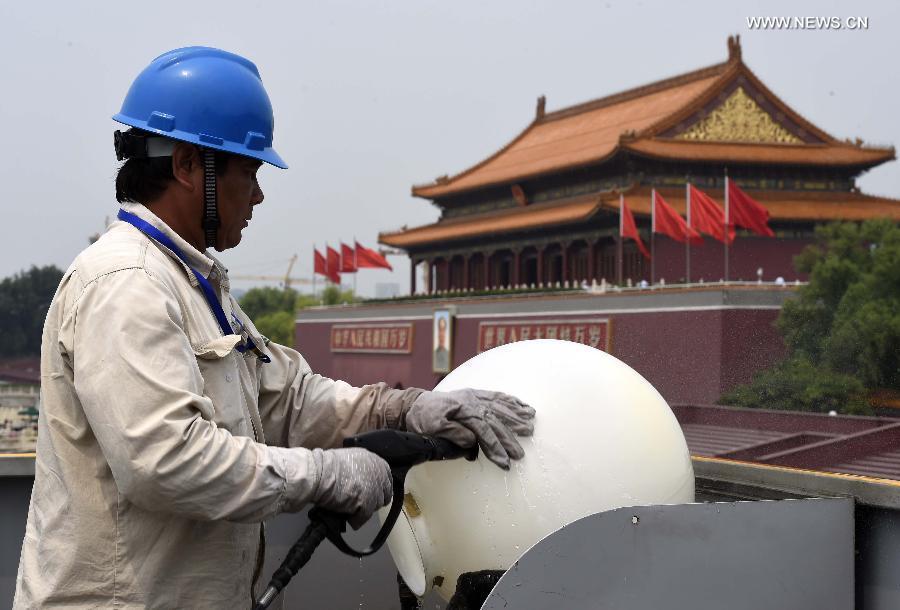 Workers clean and overhaul a lamp during the annual maintenance of city lamps near Tian'anmen Square, in Beijing, capital of China, July 6, 2015. (Photo: Xinhua/Gong Lei)