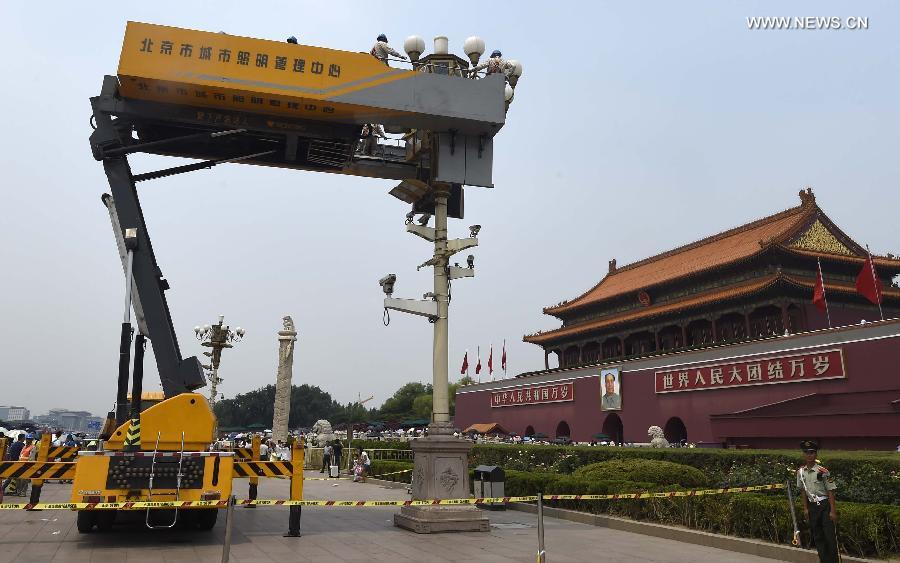 Workers clean, overhaul lamps near Tian'anmen Square in Beijng(1/5)