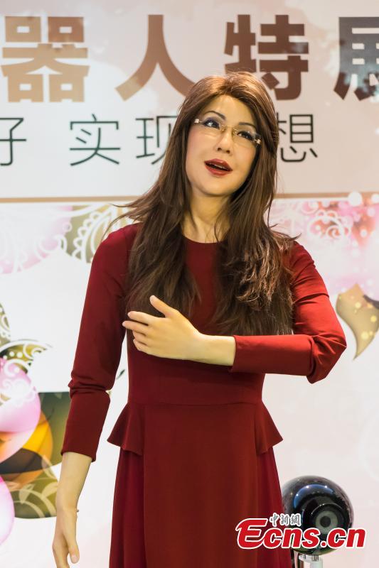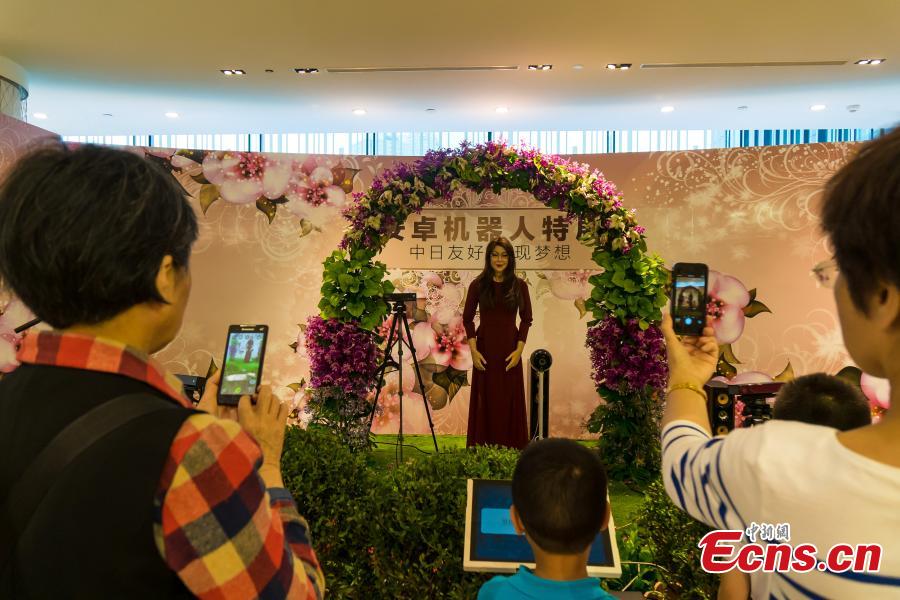 Yangyang, a humanoid robot with a variety of realistic expressions, performs during an event at a shopping mall in Shanghai, July 7, 2015. Yangyang went on display at the Global Mobile Internet Conference (GMIC) 2015 in Beijing in April. She can blink, smile, shake hands and even hug members of the audience. Japanese professor Hiroshi Ishiguro also attended the event to speak on robot development. (Photo: China News Service/Wang Gang)