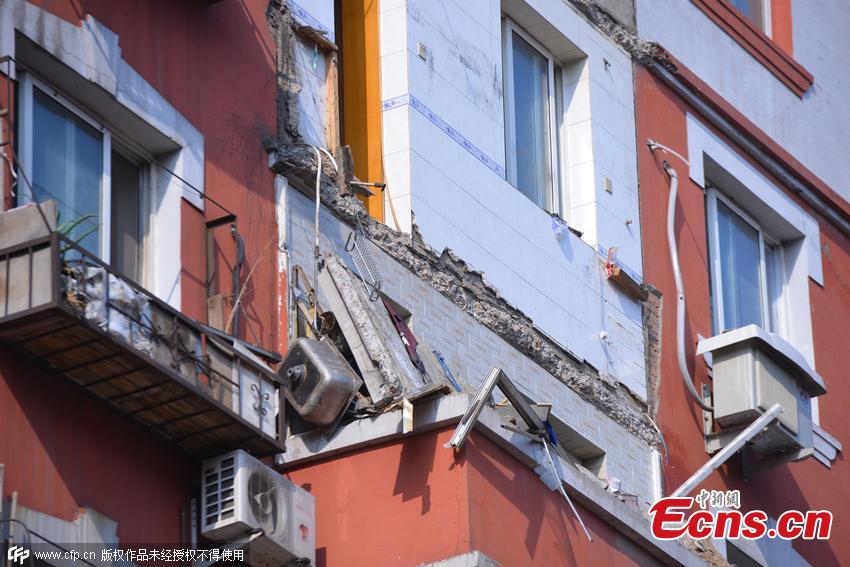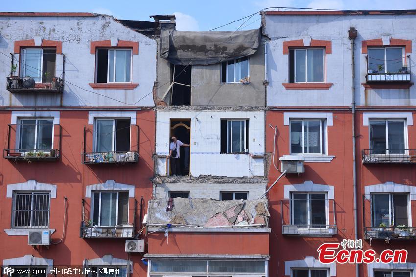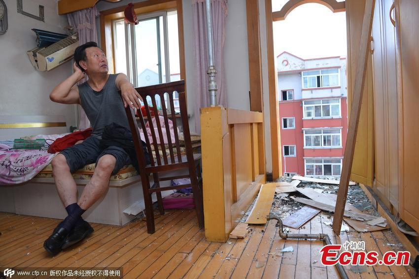 A man sits in a bedroom while a collapsed balcony can be seen in a building in Shenyang, Northeast China’s Liaoning province, July 7, 2015. A woman living in the building says she was surprised to find the balcony had disappeared while she was in the kitchen chopping meat to make dumplings. (Photo/CFP)